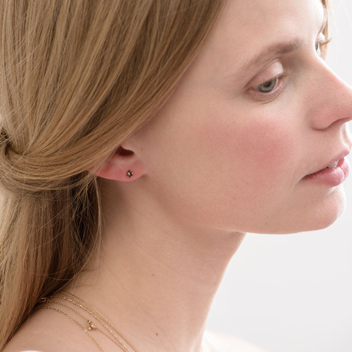 tiny studs set in a 6 prong setting with inverted (pointed surface) champagne diamonds.