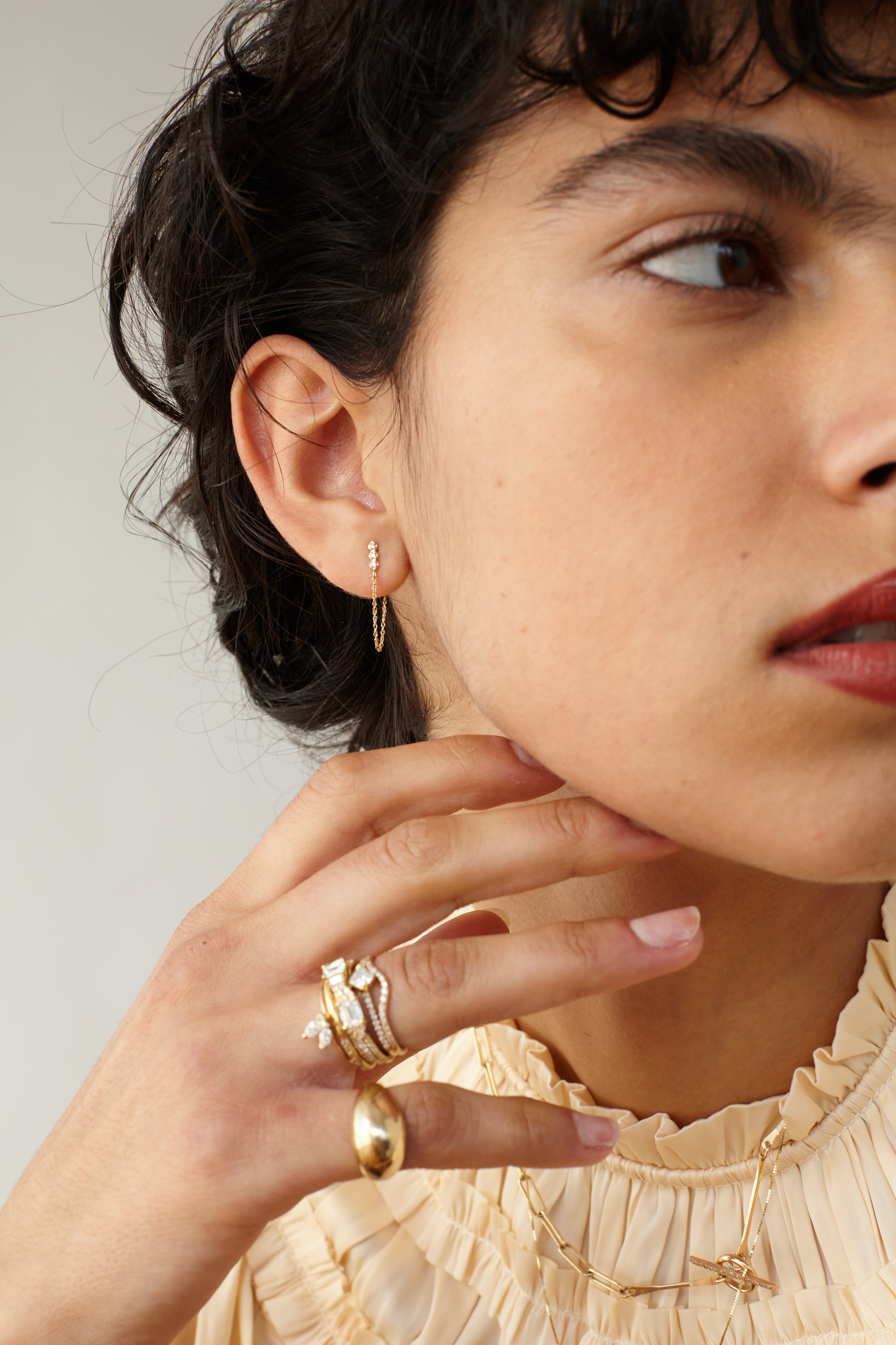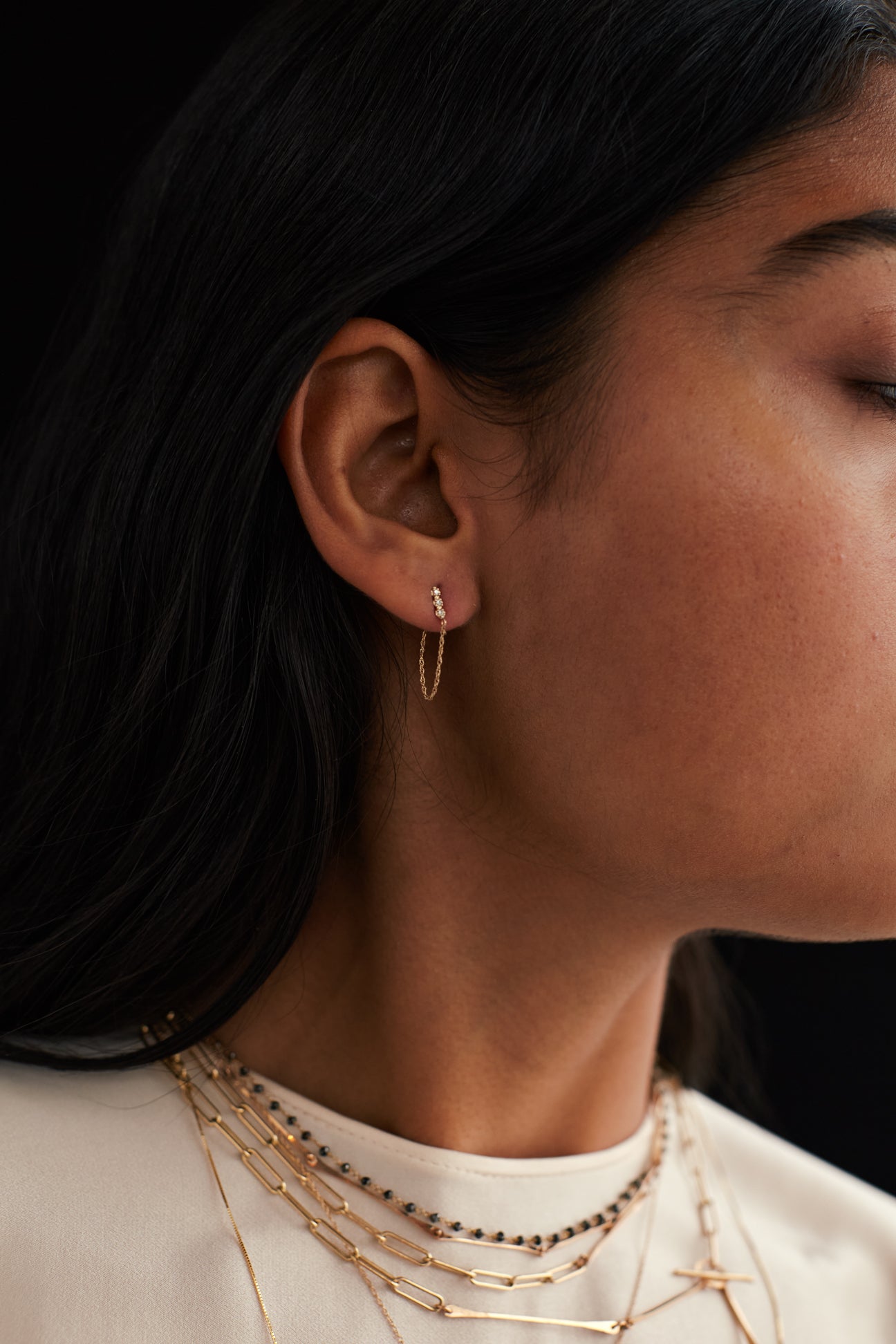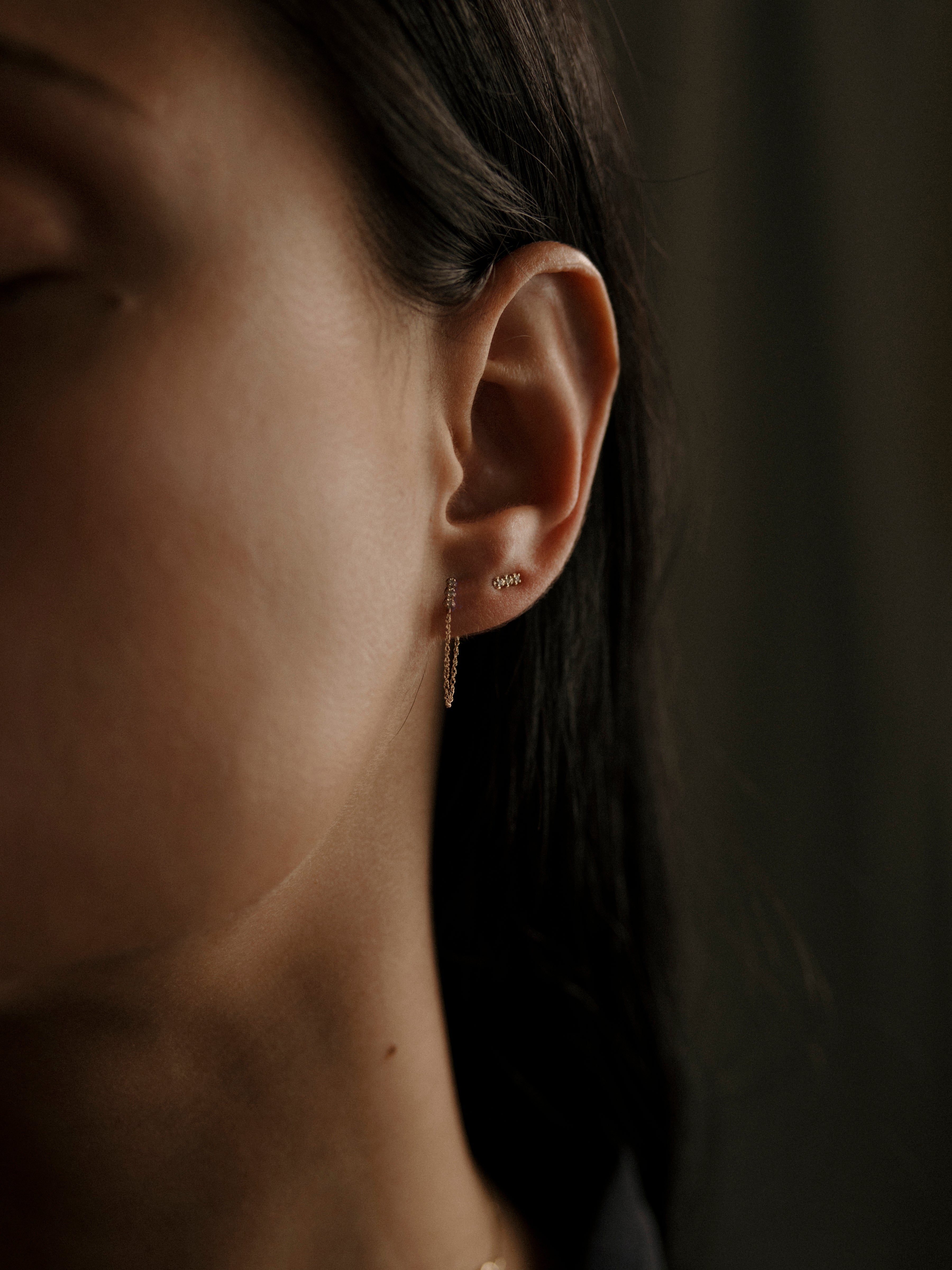 each stud earring has three white diamonds small chain and ear back-  perfect for everyday wear. Handmade in NYC