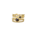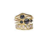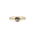 An glittering center rosecut black diamond nestled between white diamonds with eight diamonds on the band. Also available in white diamond.