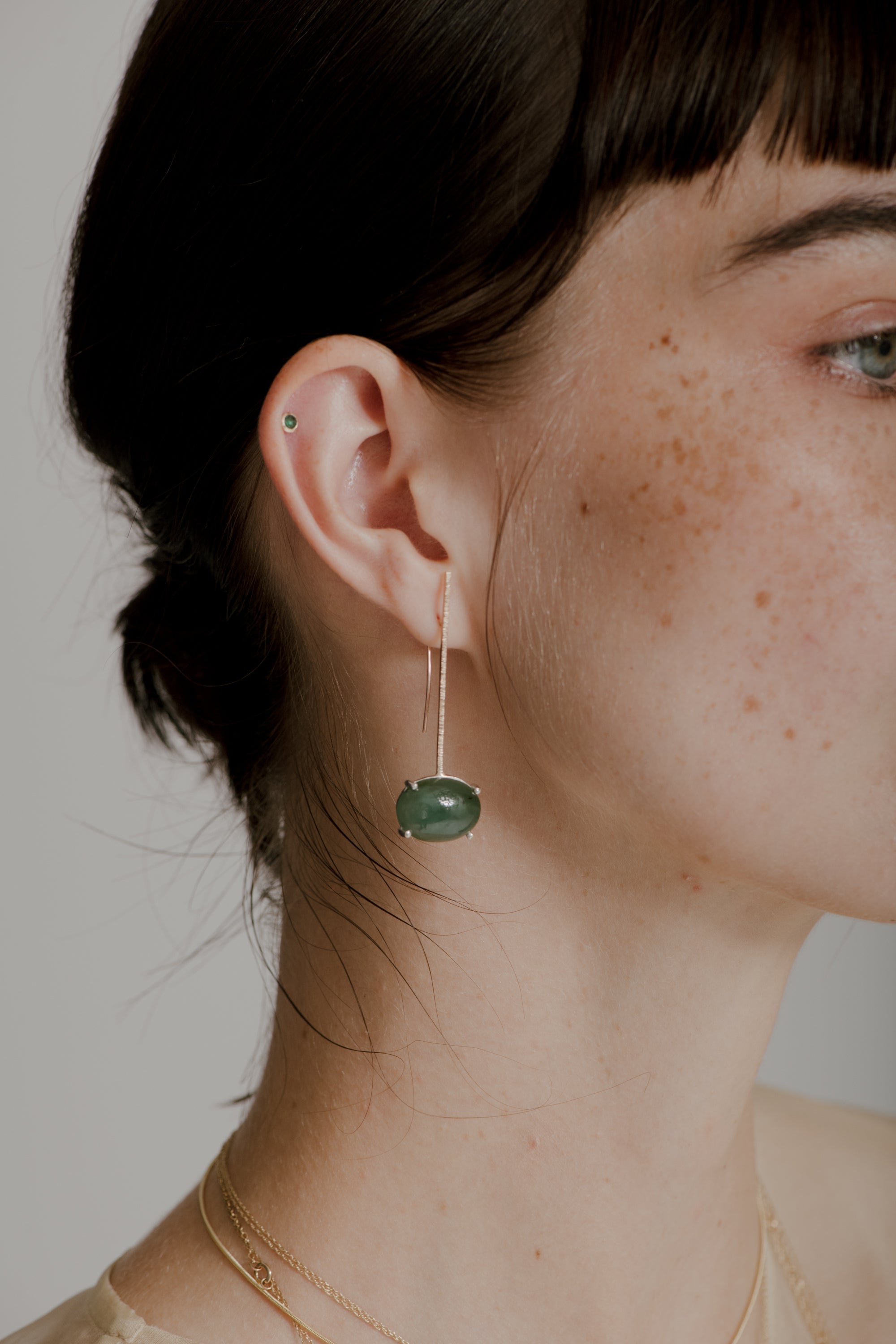 elegant drop earrings featuring a textured bar of 14k yellow gold with a sterling silver prong setting and an oval cabochon jade or black onyx.