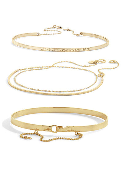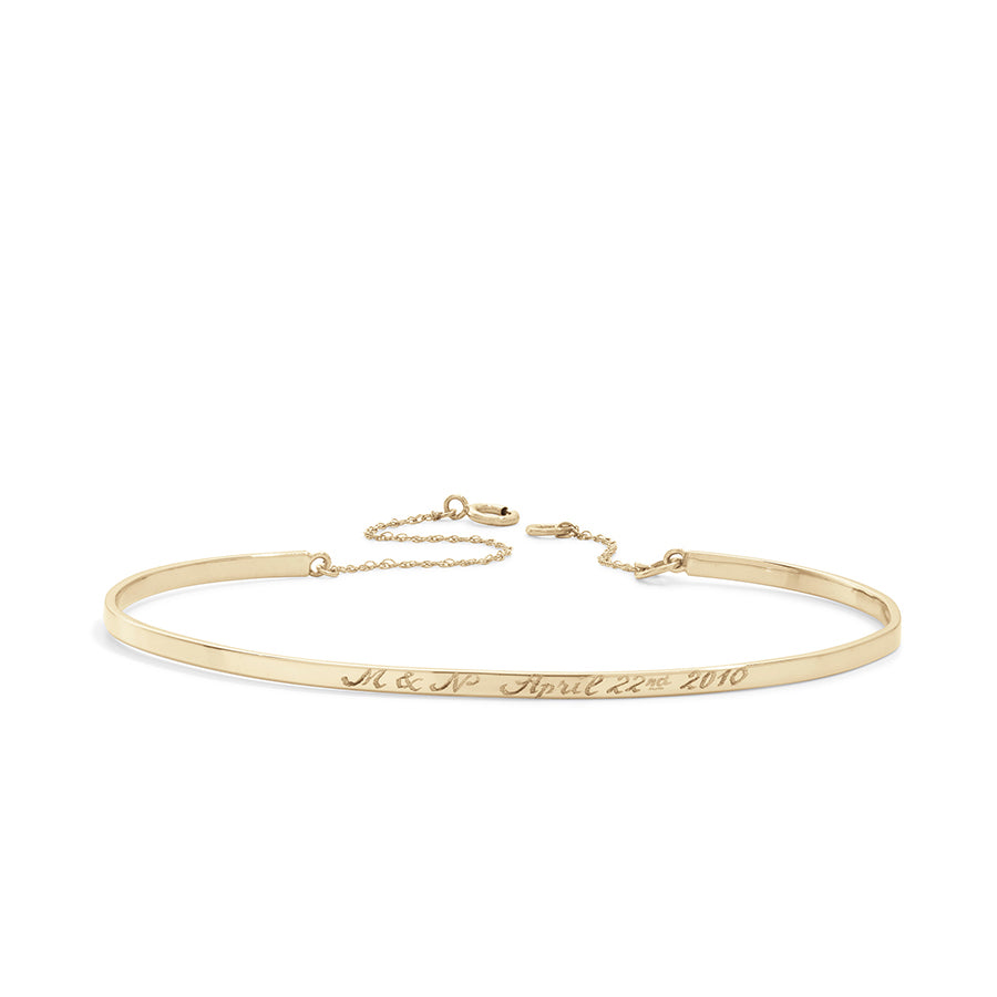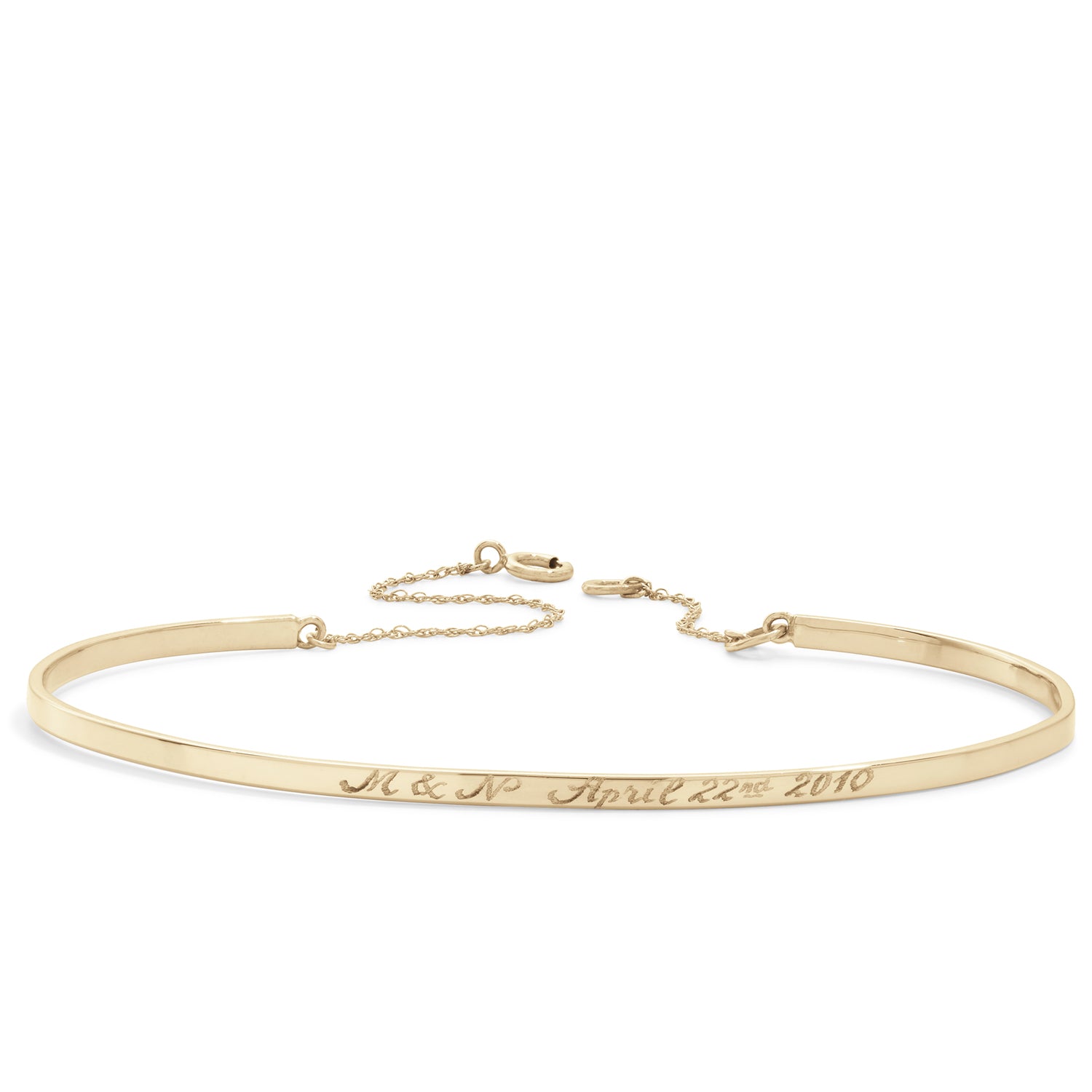 14k yellow or rose gold bangle with cable chain and spring clasp closure. there is the option to personalize this bracelet with a pencil hand engraving.