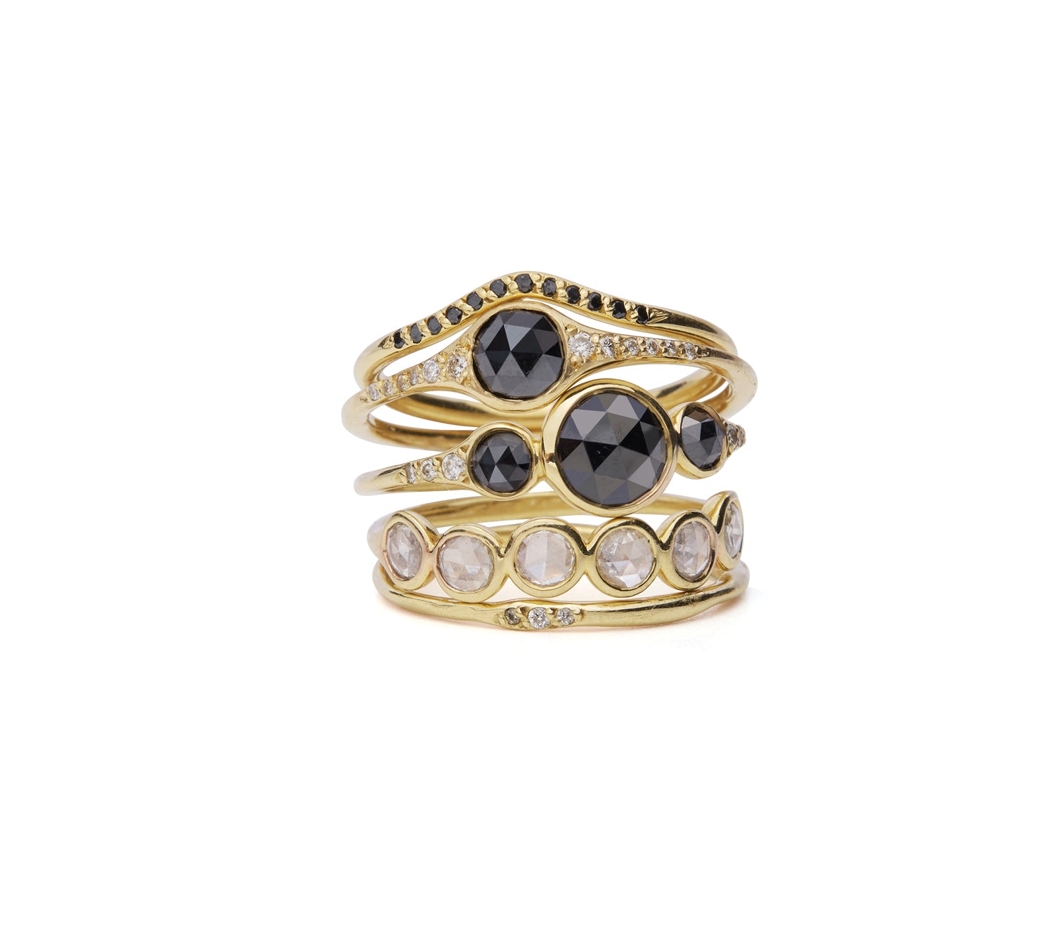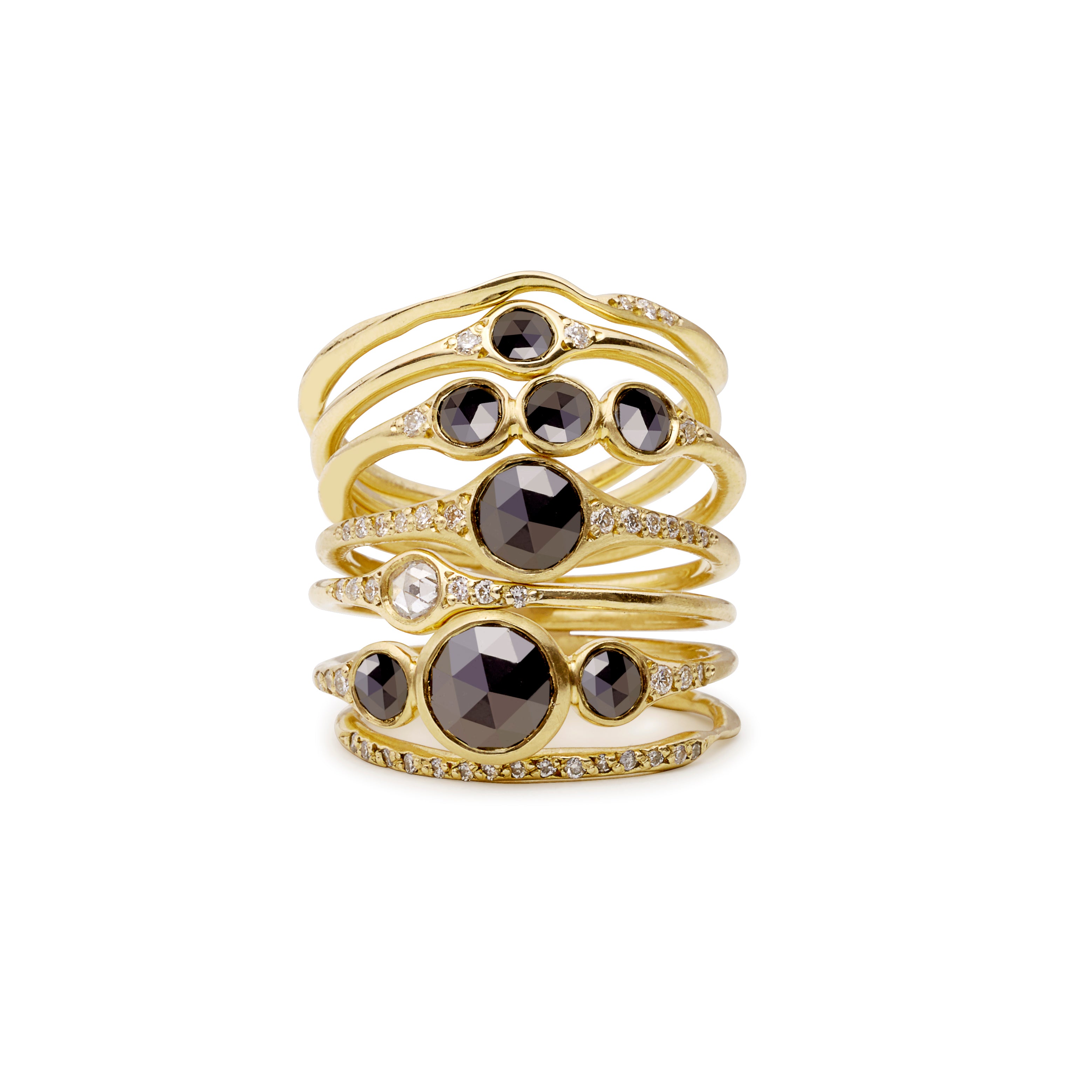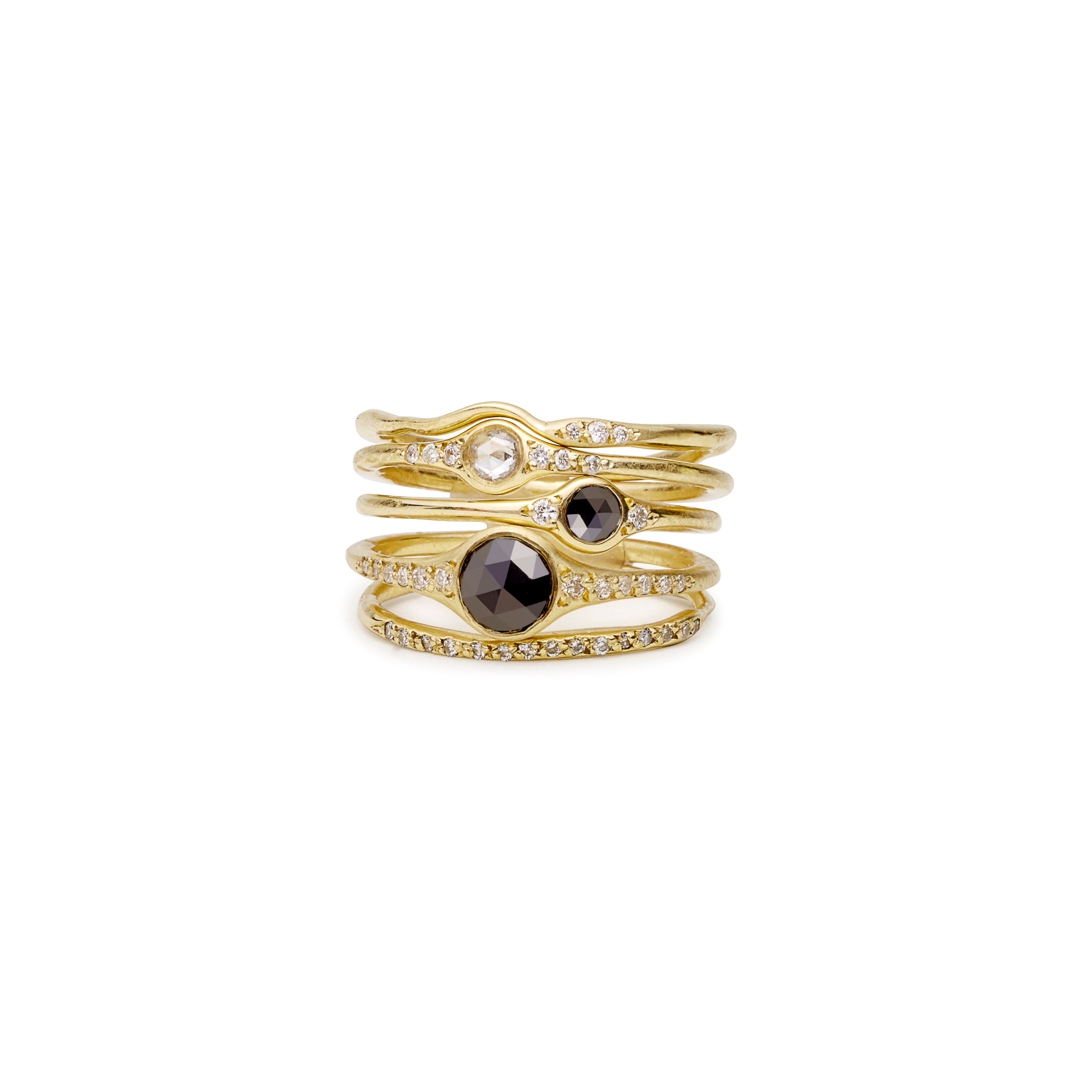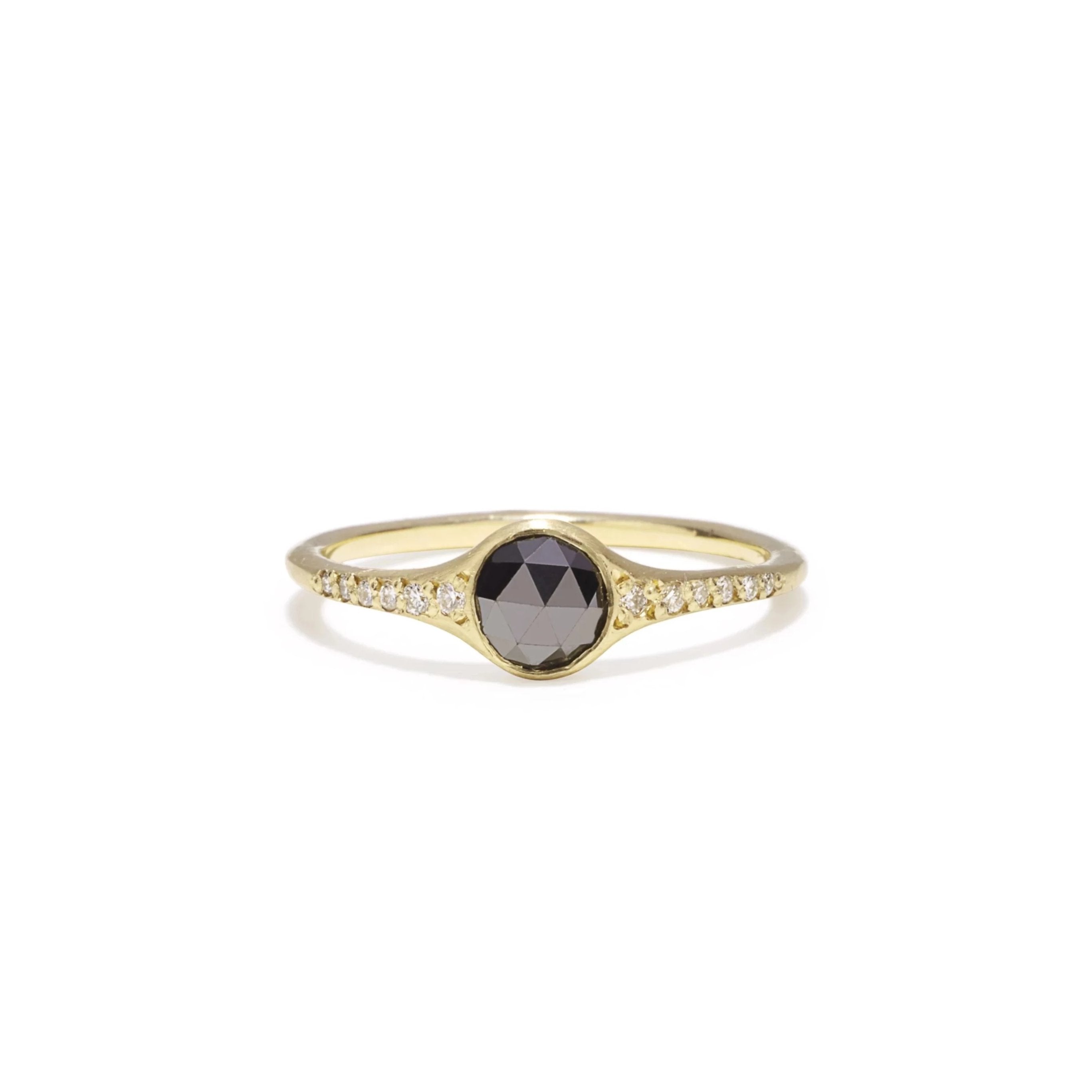 An glittering center rosecut black diamond nestled between white diamonds with eight diamonds on the band. Also available in white diamond.