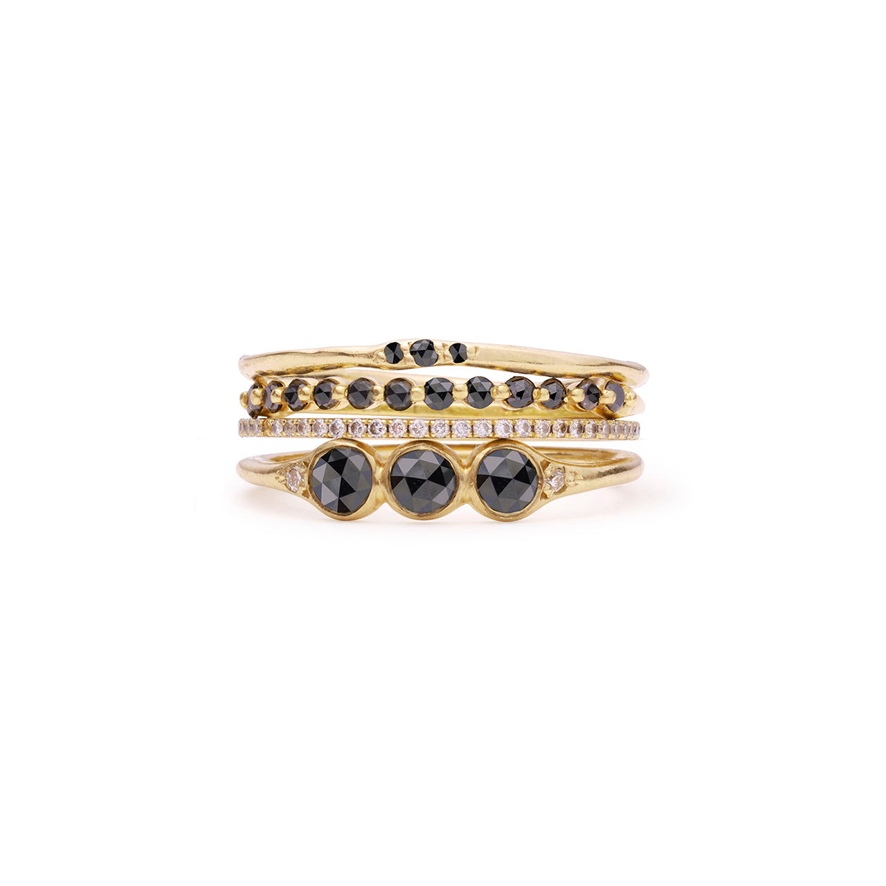 a gold ring with three round rosecut black diamonds and two white diamonds. also available in white diamond, opal, and emerald. size 6.5 with black diamonds only ready to ship
