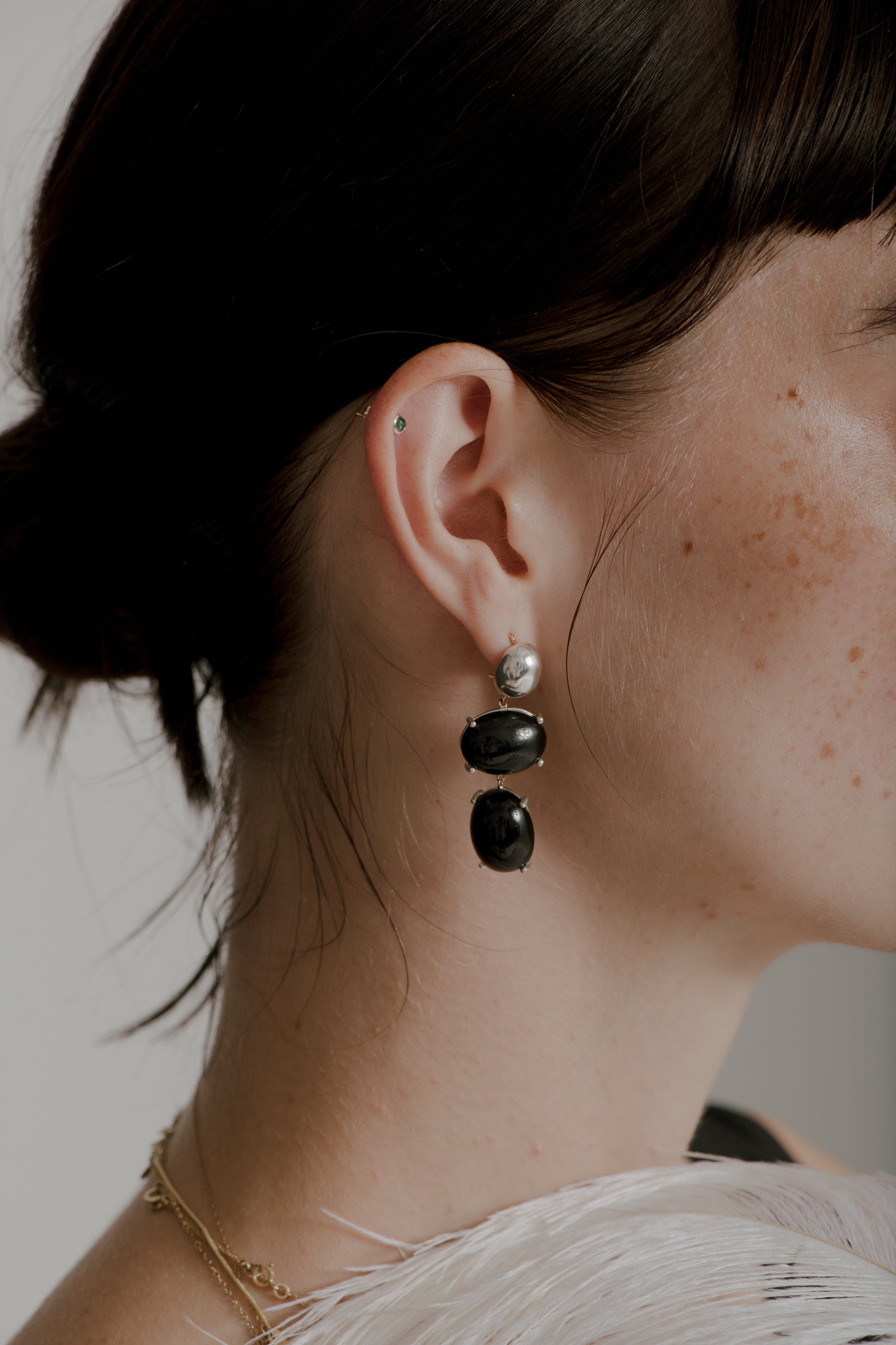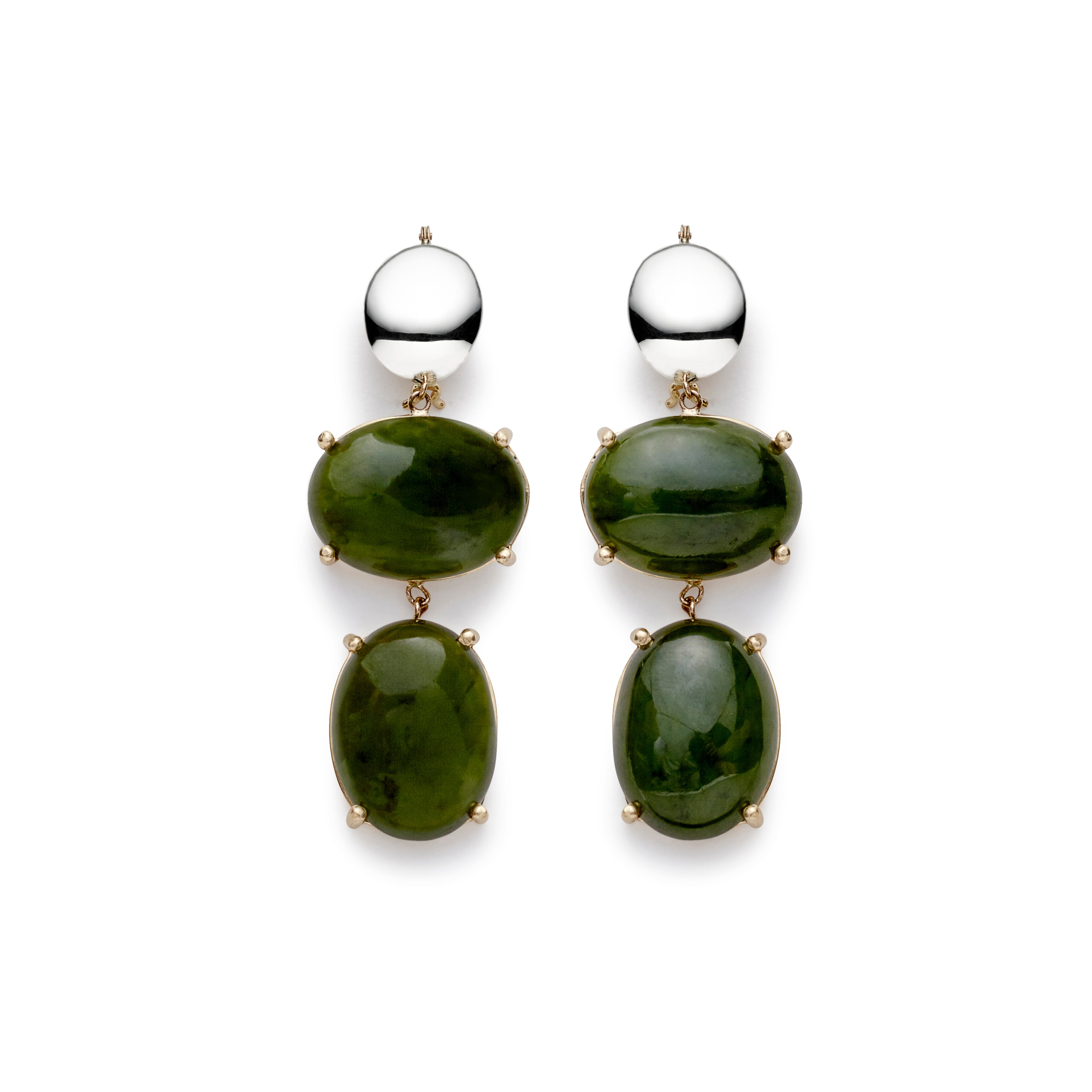 elegant drop earrings featuring glossy oval black onyx cabochons set in sterling silver prongs or rich oval jade cabochon stones set in 14k yellow gold prongs with sterling silver dome accents.