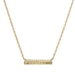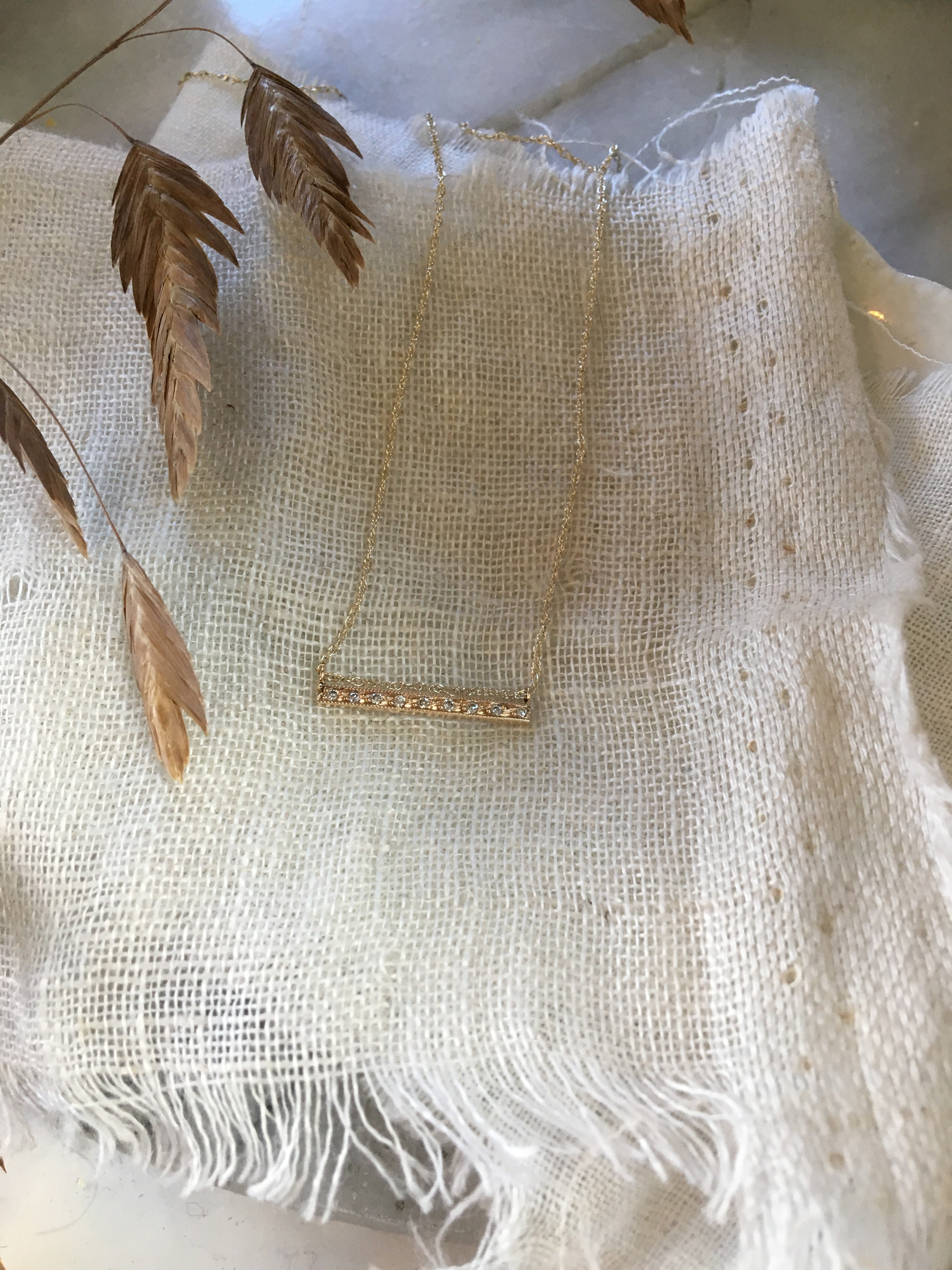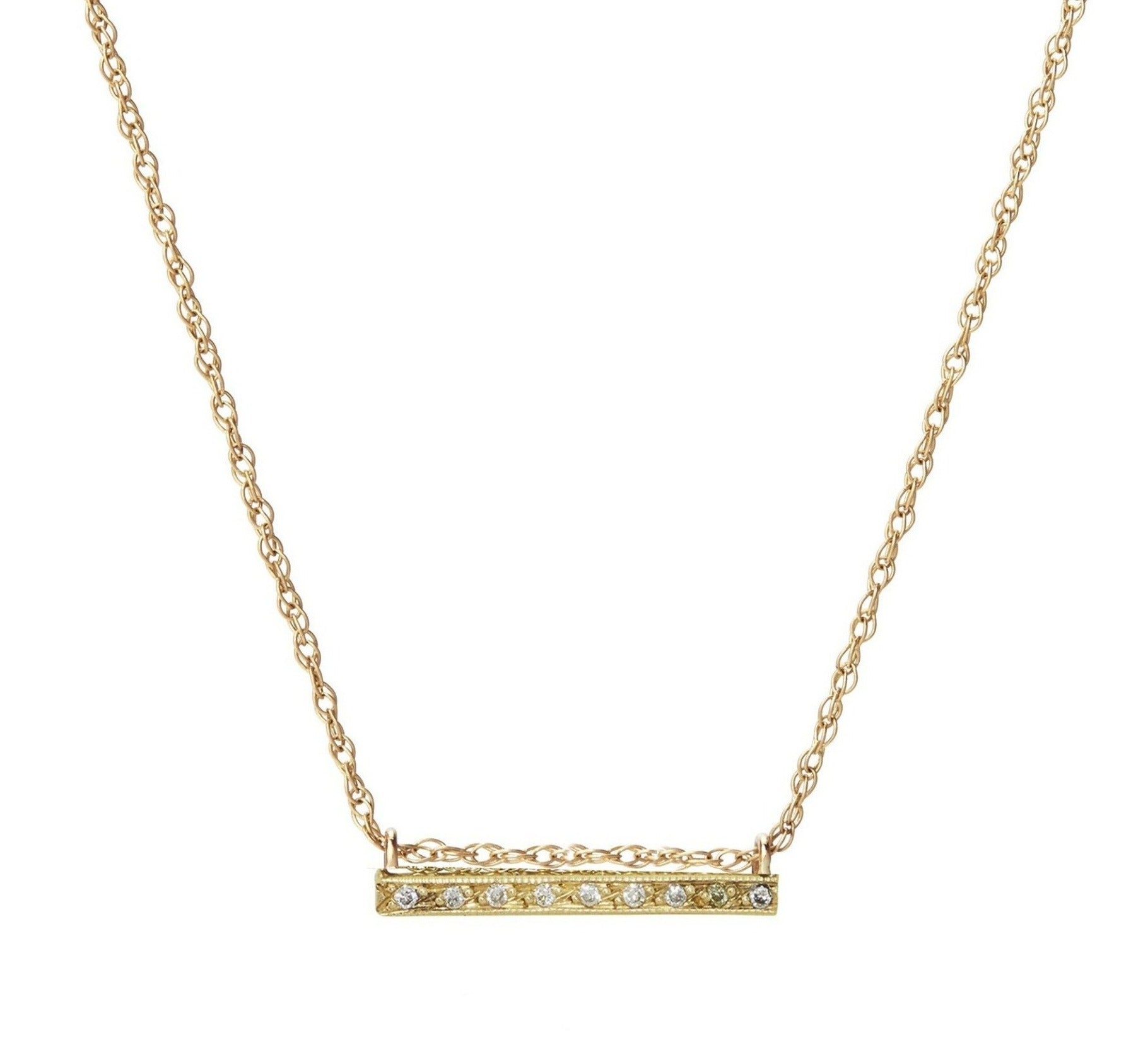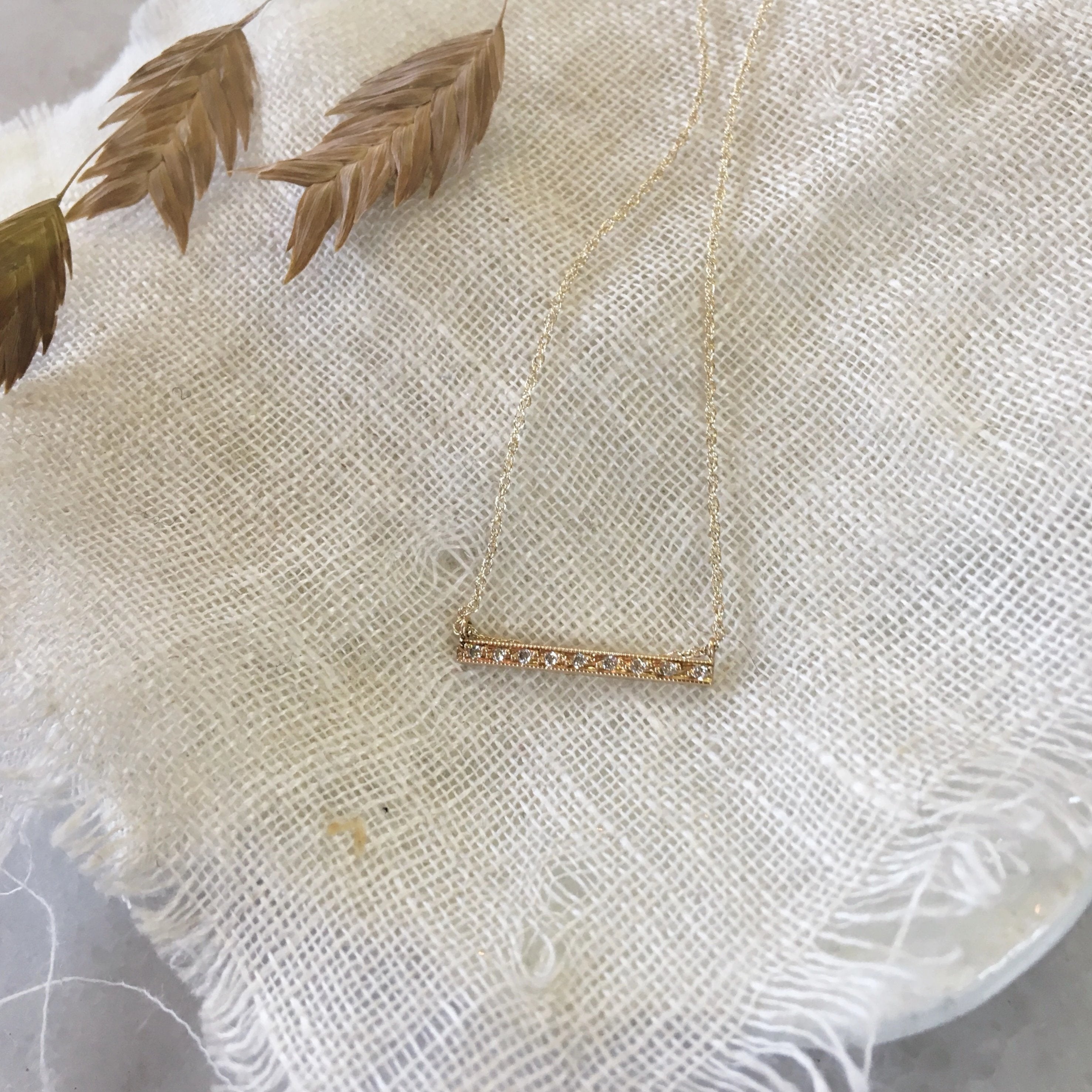 delicate cable chain and horizontal sliding bar pendant with white diamonds set pavé with milgrain detail.