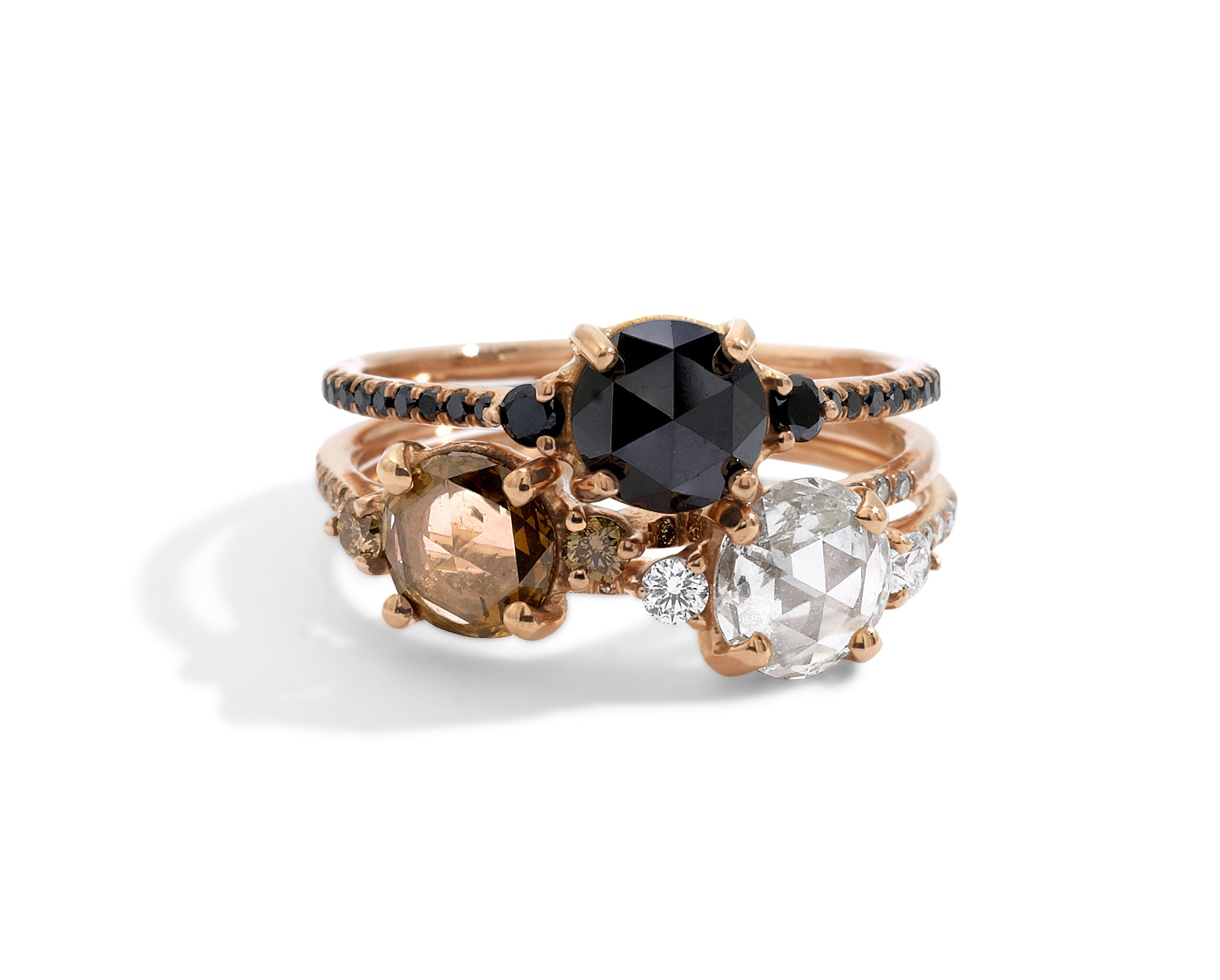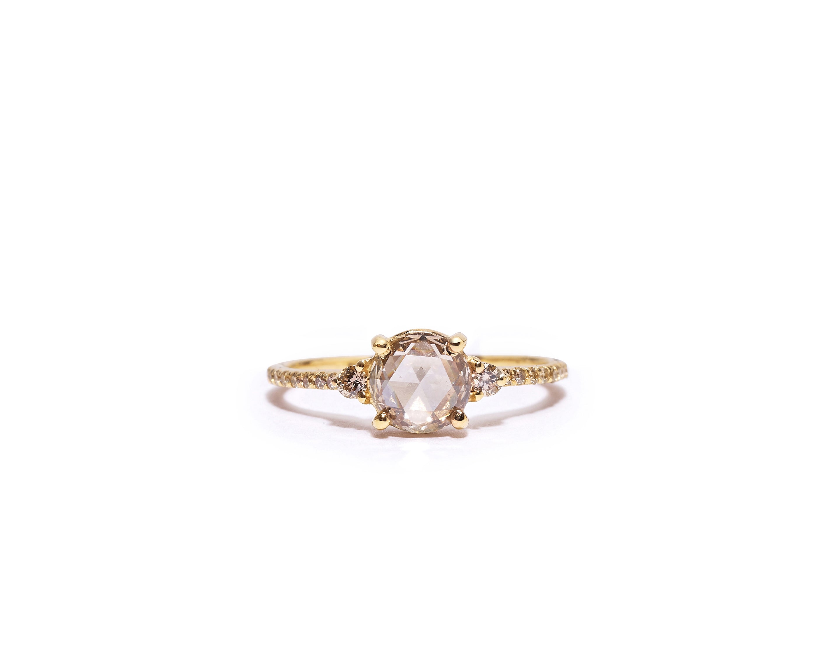 An ethereal center champagne diamond nestled between two tiny brilliant cut champagne diamonds, and champagne diamonds set pavé on the band. Yellow gold or Rose gold 18ky