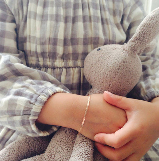 slim and dainty thin baby bracelet made with thin flat wire and 3 tiny white diamonds set pavé.