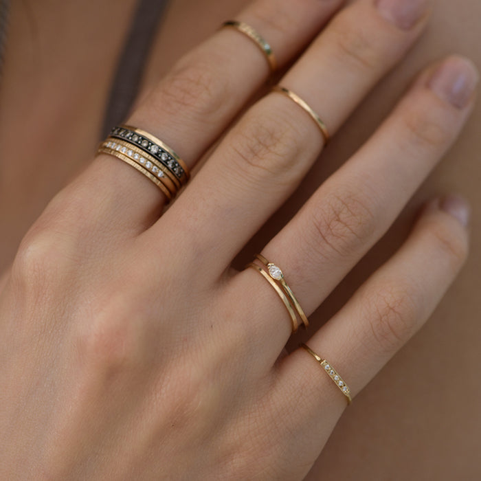 stacking bar ring with five white diamonds set pavé and milgrain.