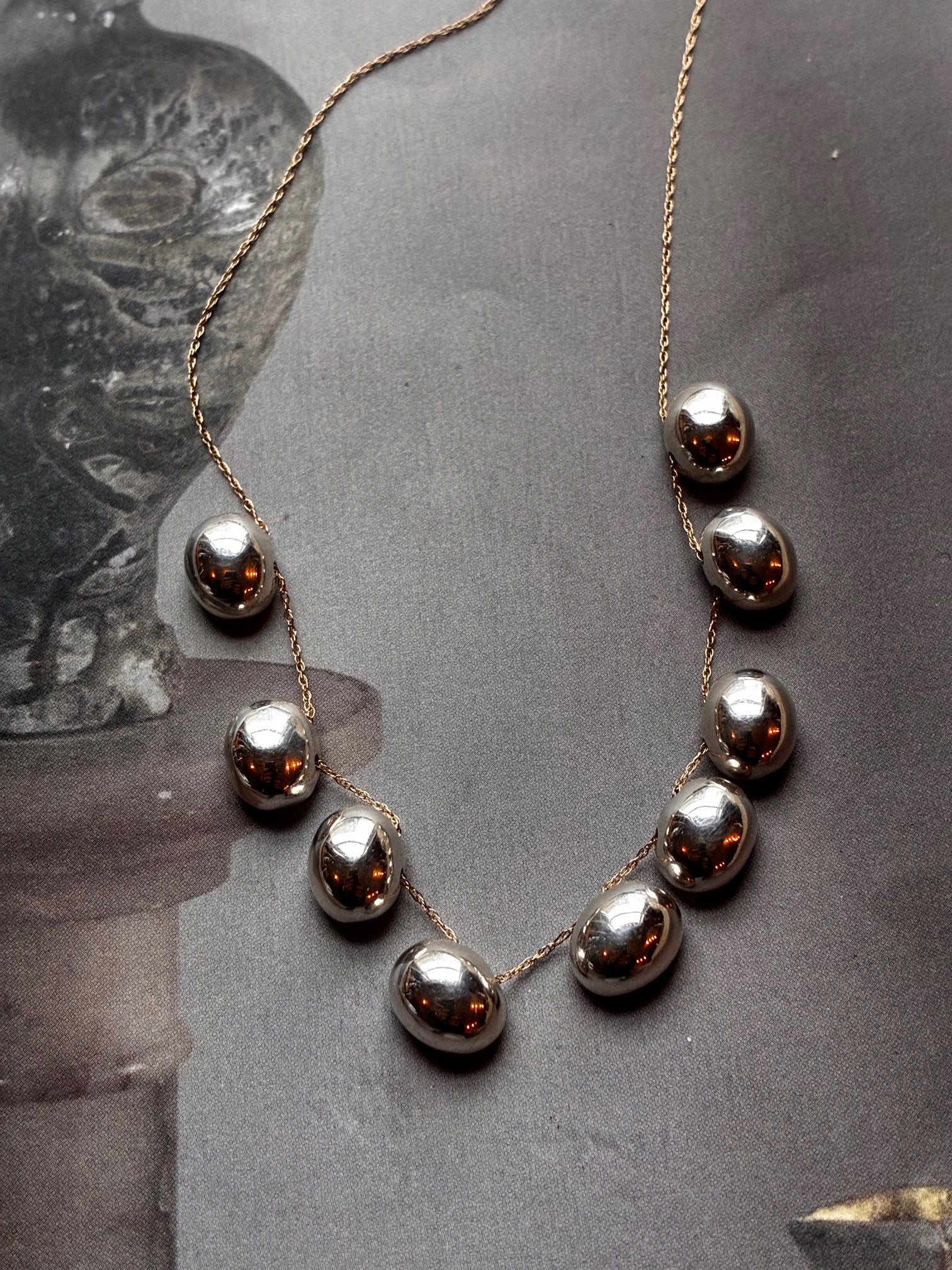 10 silver beads on a  14k yellow gold chain . Approx 16" long
