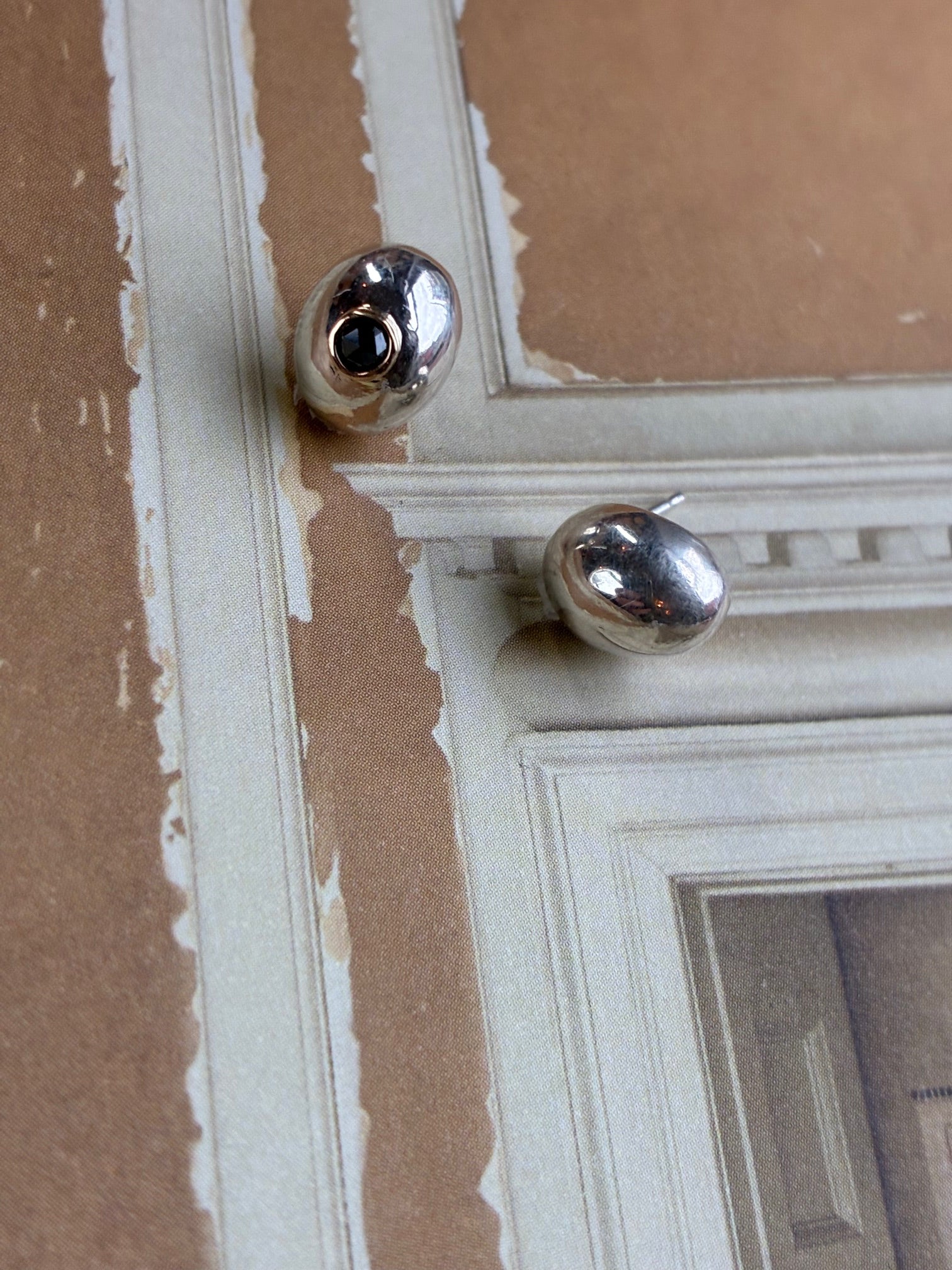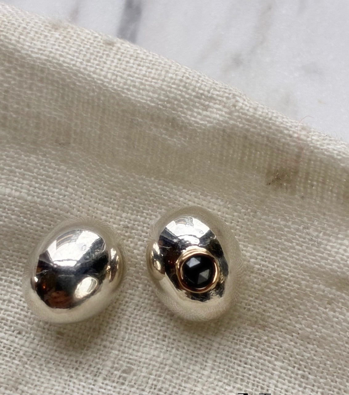 dome sterling silver stud with a 14k bezel and a 3mm black diamond- sold individually. Mix with our Sterling silver dome studs or get 2 as a matching pair. 14k yellow gold post & back