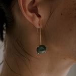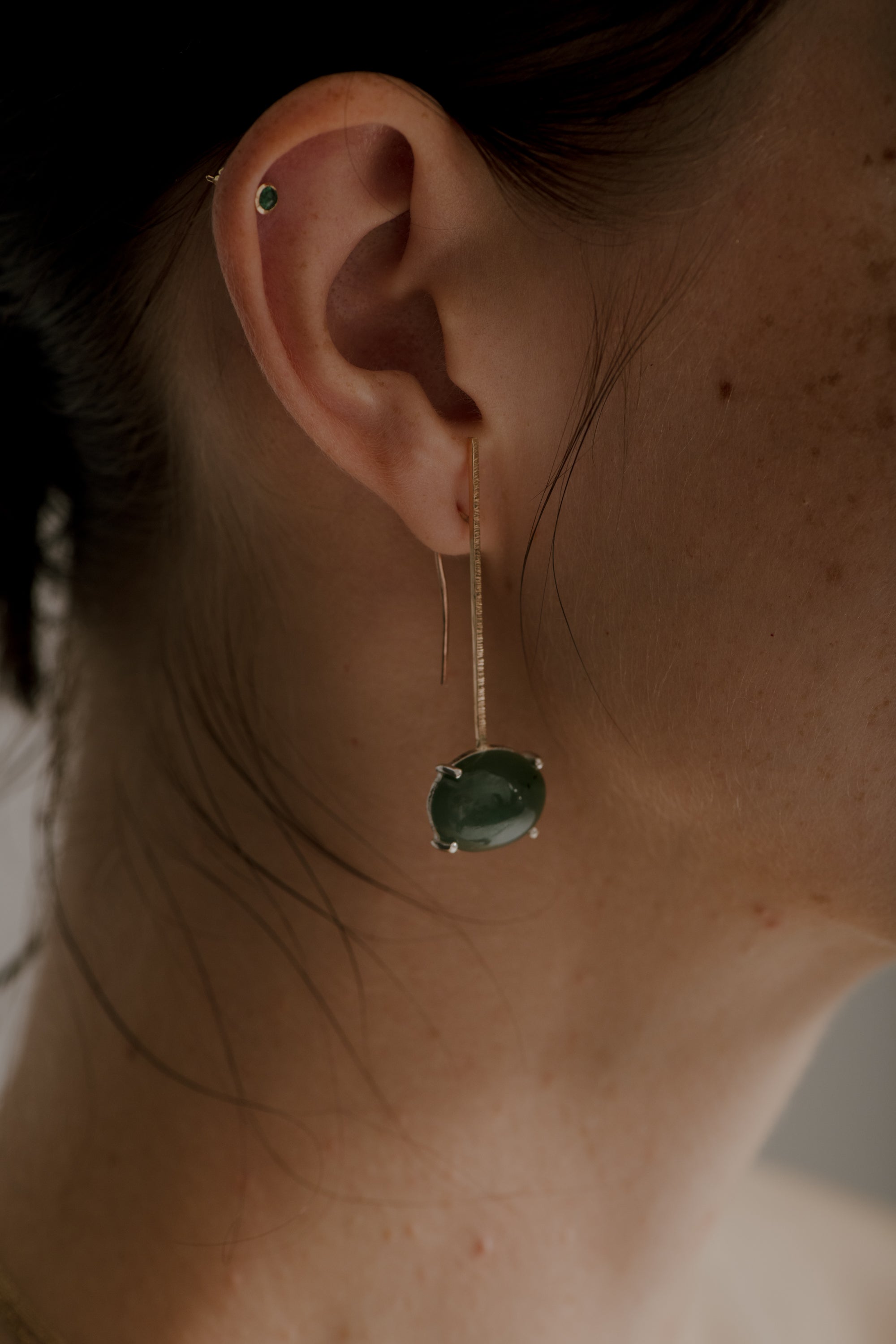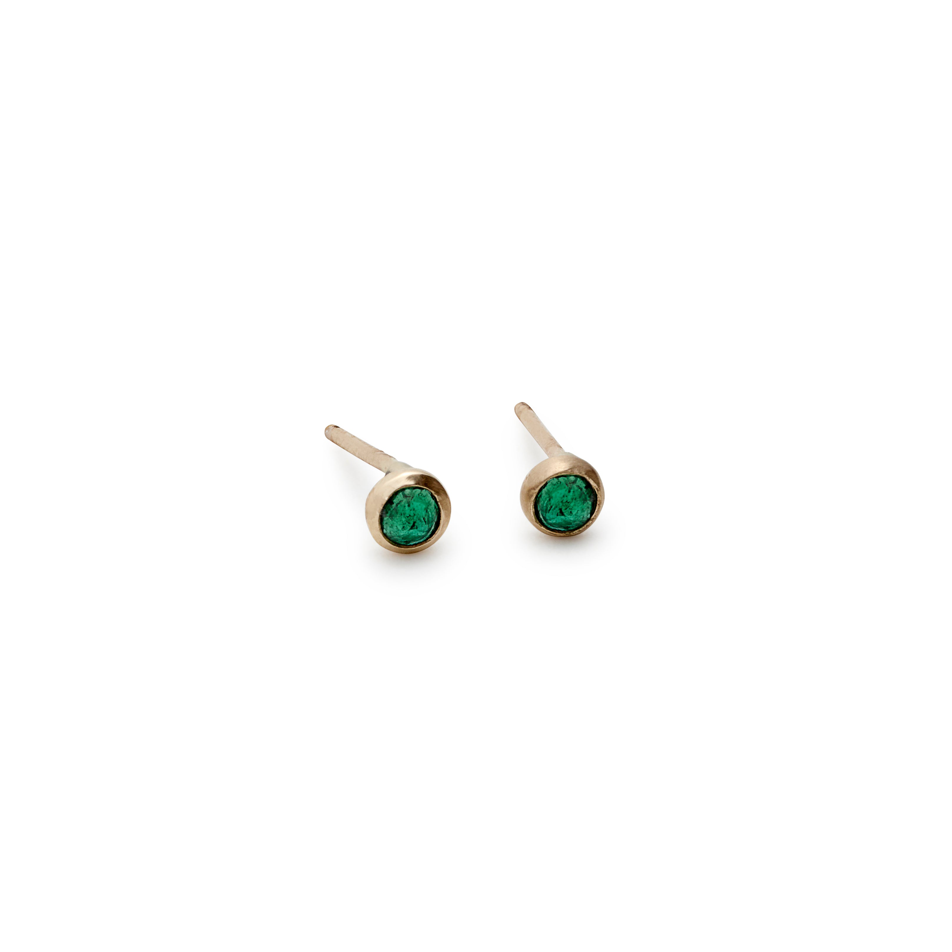 14k yellow gold studs with one faceted emerald set in a bezel. Sold individually.