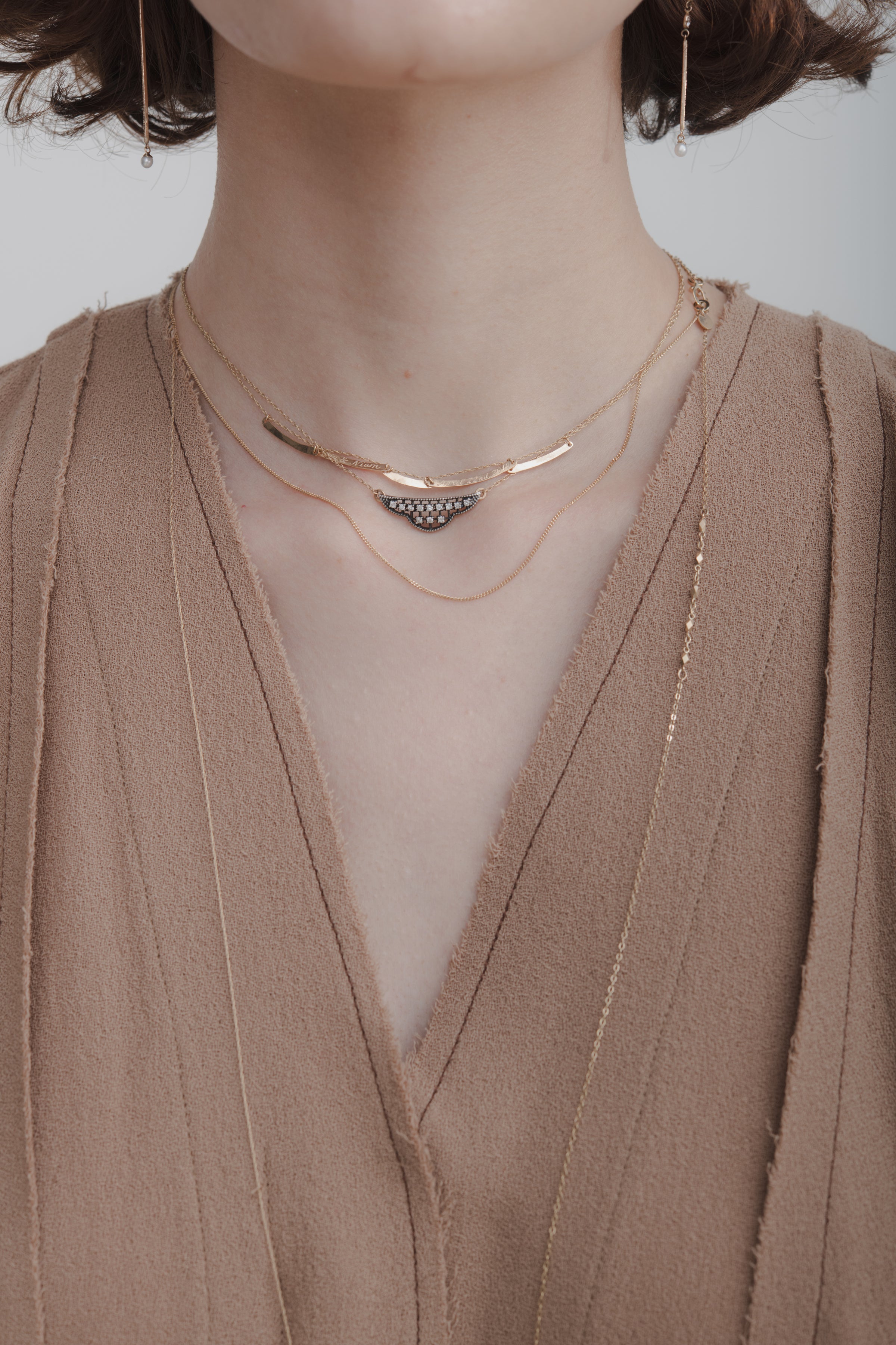 filigree necklace with oxidized silver white diamond pendant and thin yellow gold rope chain.
