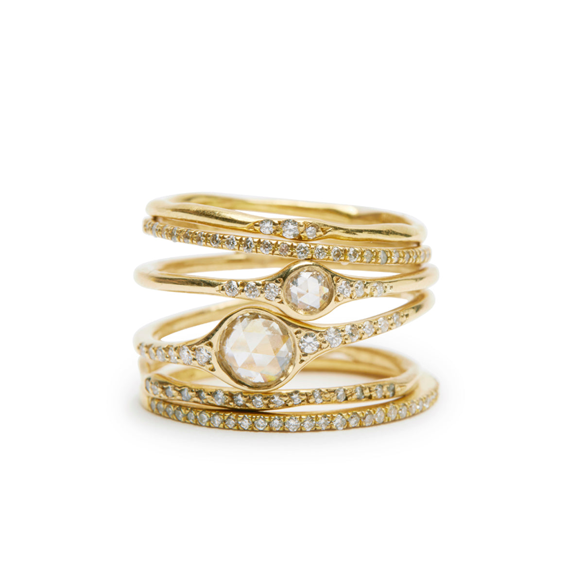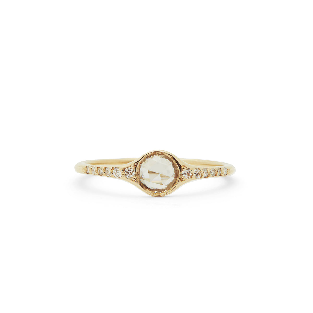 An ethereal center rosecut diamond nestled between white diamonds with eight diamonds on the band. also available in black diamond.