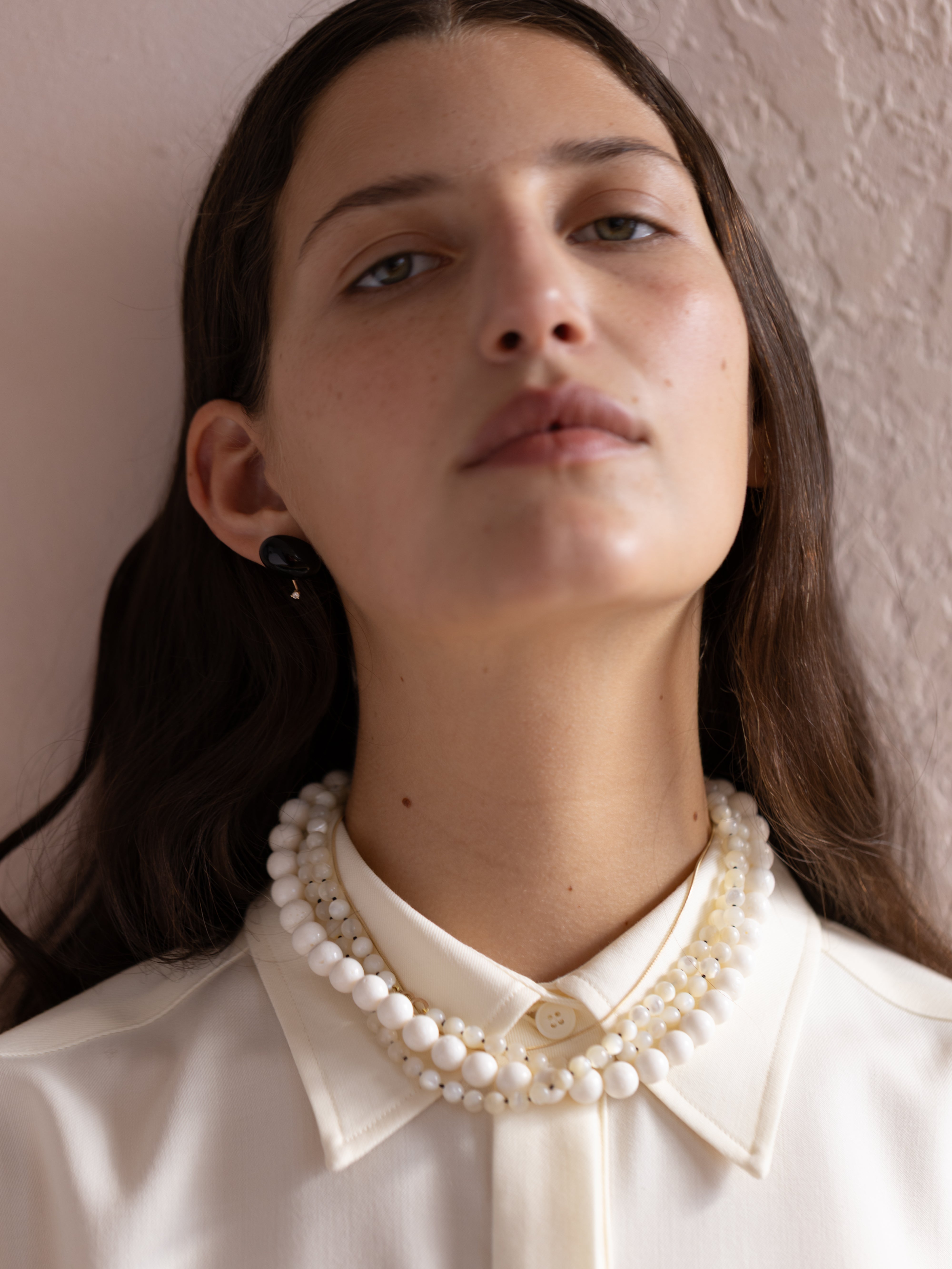 round natural white coral beaded necklace with our signature handmade wavy clasp in sterling silver. 16" long. beads measure 10mm in diameter.