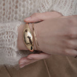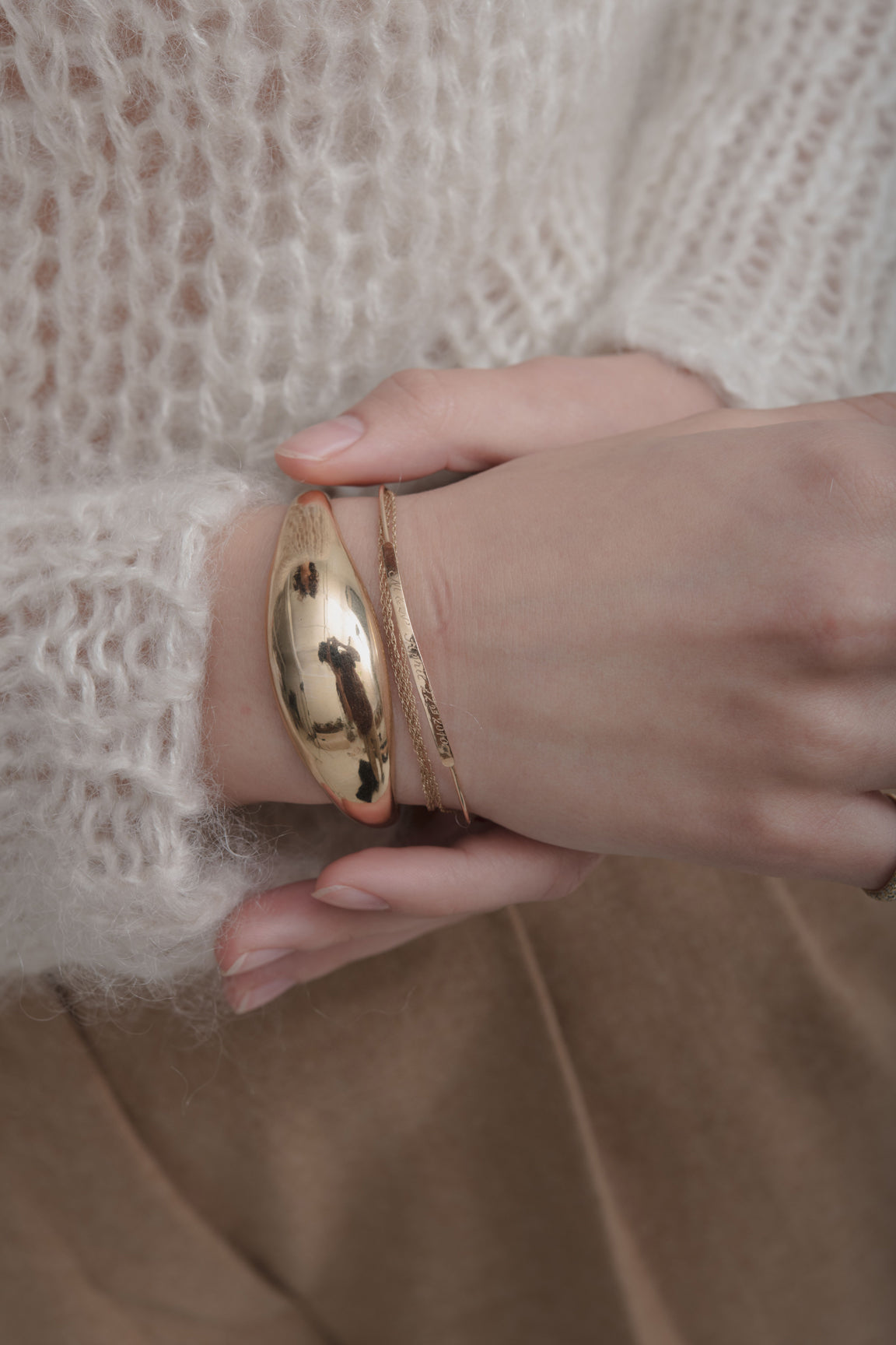 solid sterling silver cuff bracelet with a 14k yellow gold chain and spring clasp closure.
