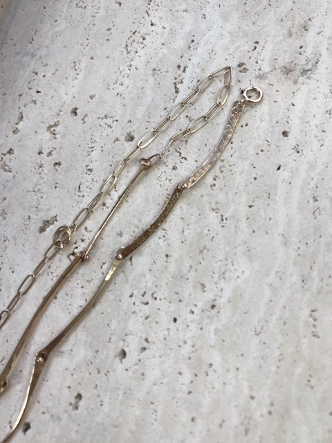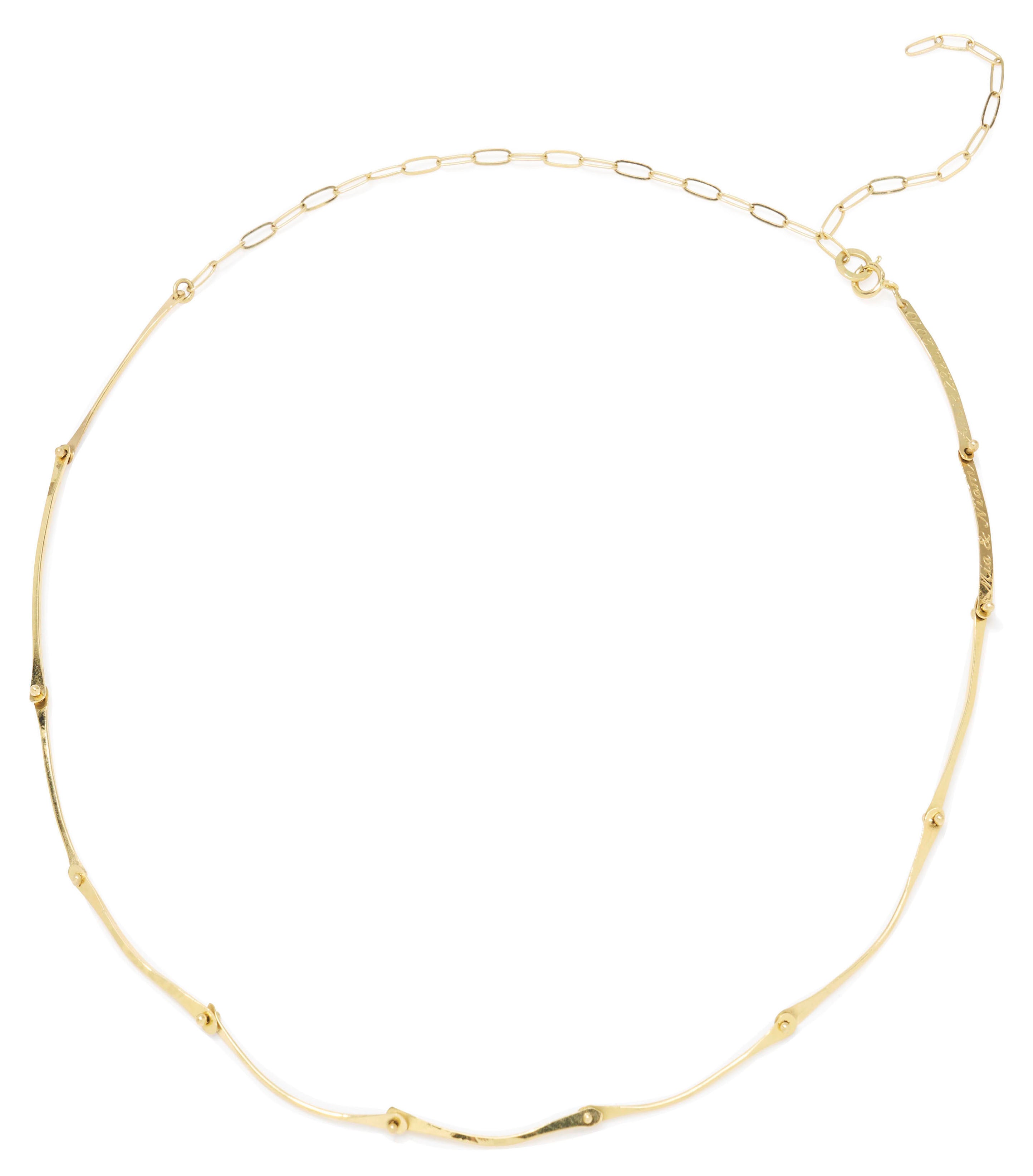 handmade in 14k yellow gold , hand forged with rivets. total length approx. 16" with adjusting jumpring at 14". can be engraved