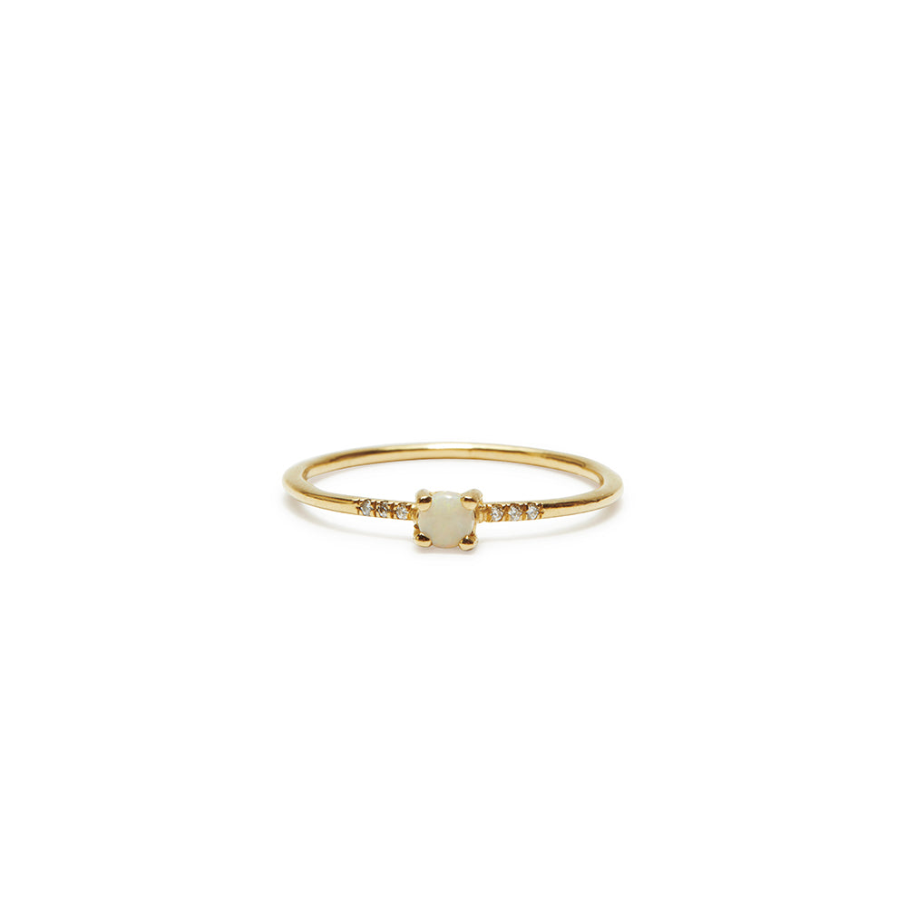 prong solitaire with a 3mm opal set on a 4-prong basket and three white diamonds set pavé at either side. perfect as a single ring or stacked with others.