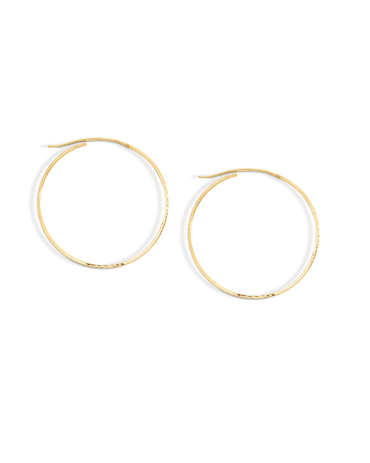 14k yellow gold hoop earrings with a matte hammered texture and hook closure.