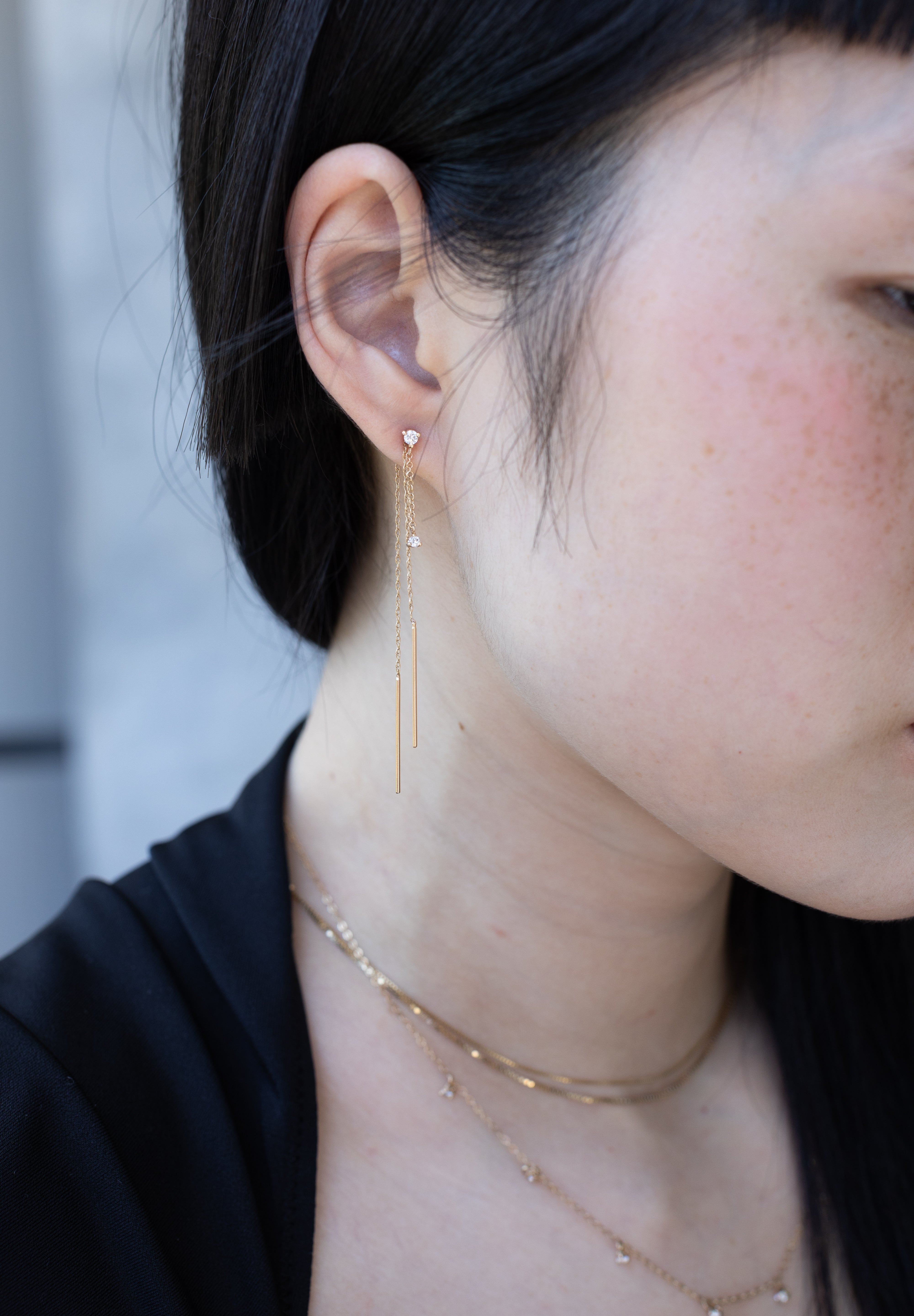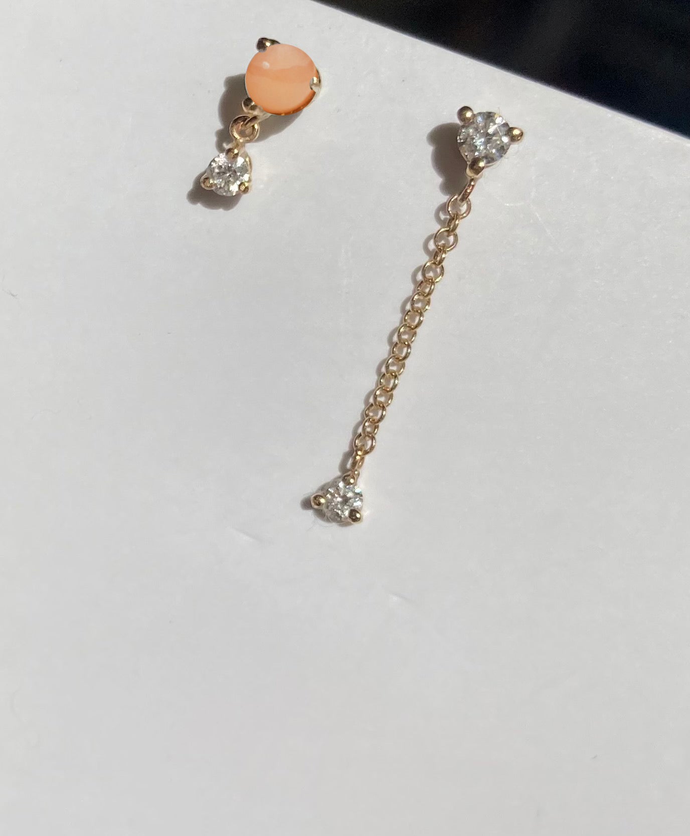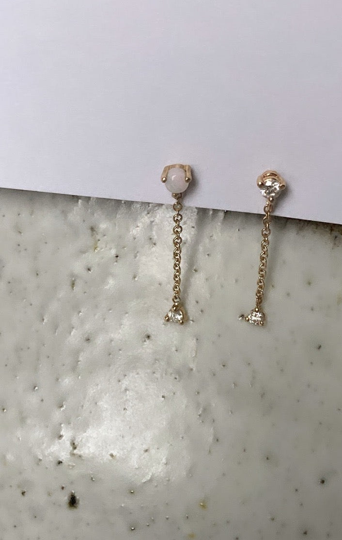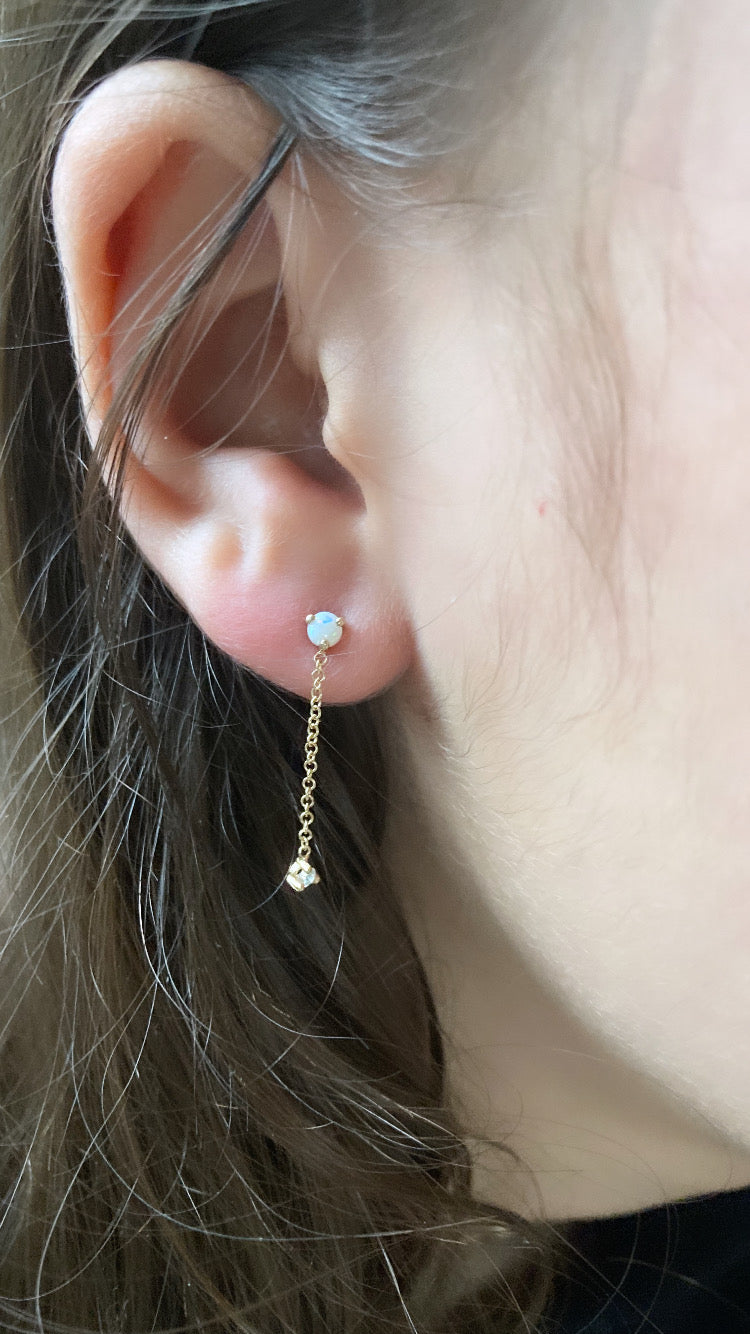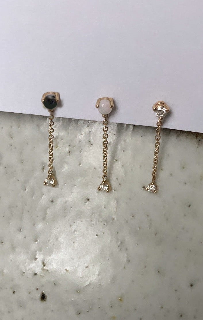 14k yellow gold stud with chain and dainty tiny diamond drop. Choose top stone to be Opal, pink coral, or black diamond. Sold individually.