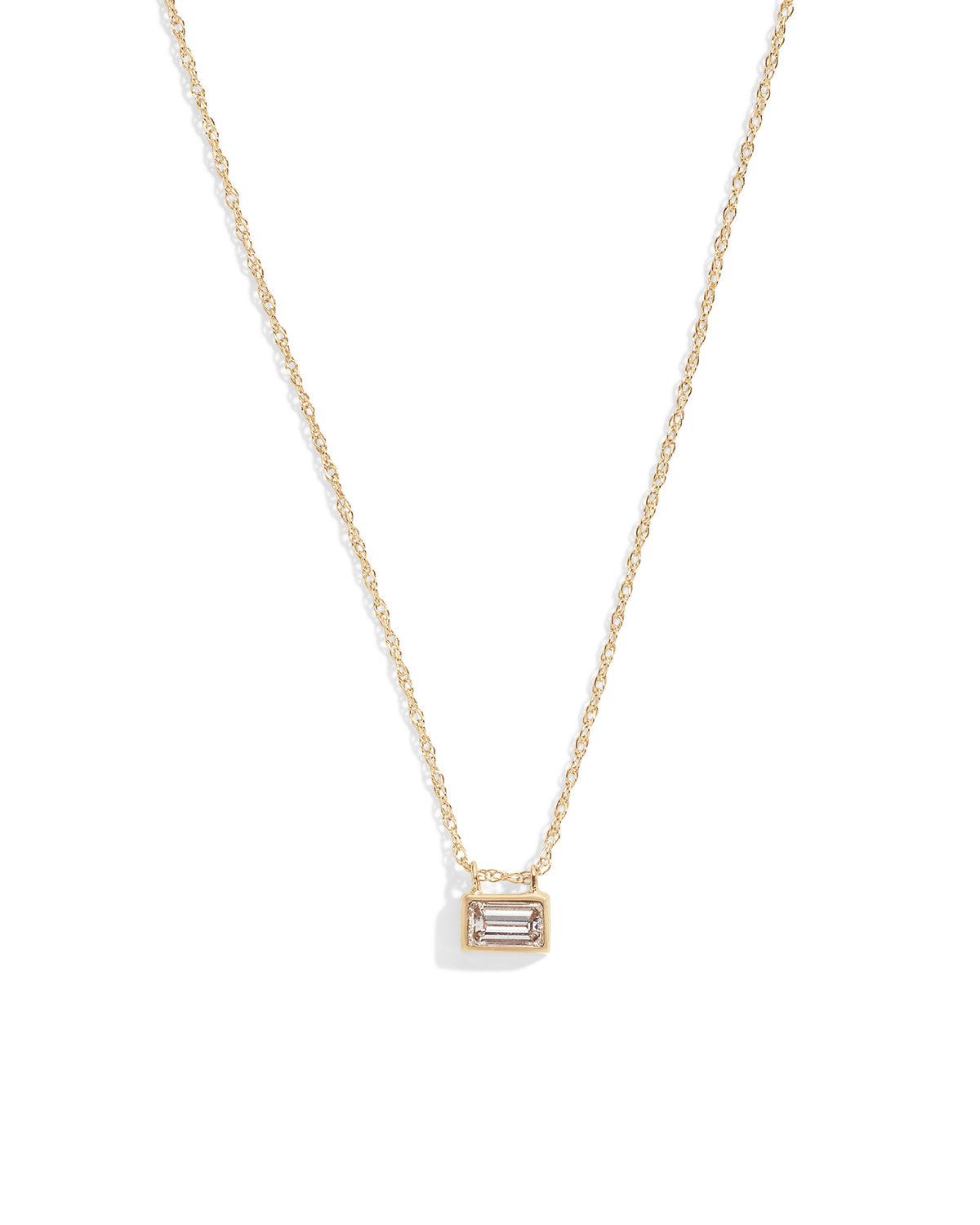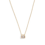 elegant 14k yellow gold necklace with a white diamond in a bezel setting.