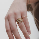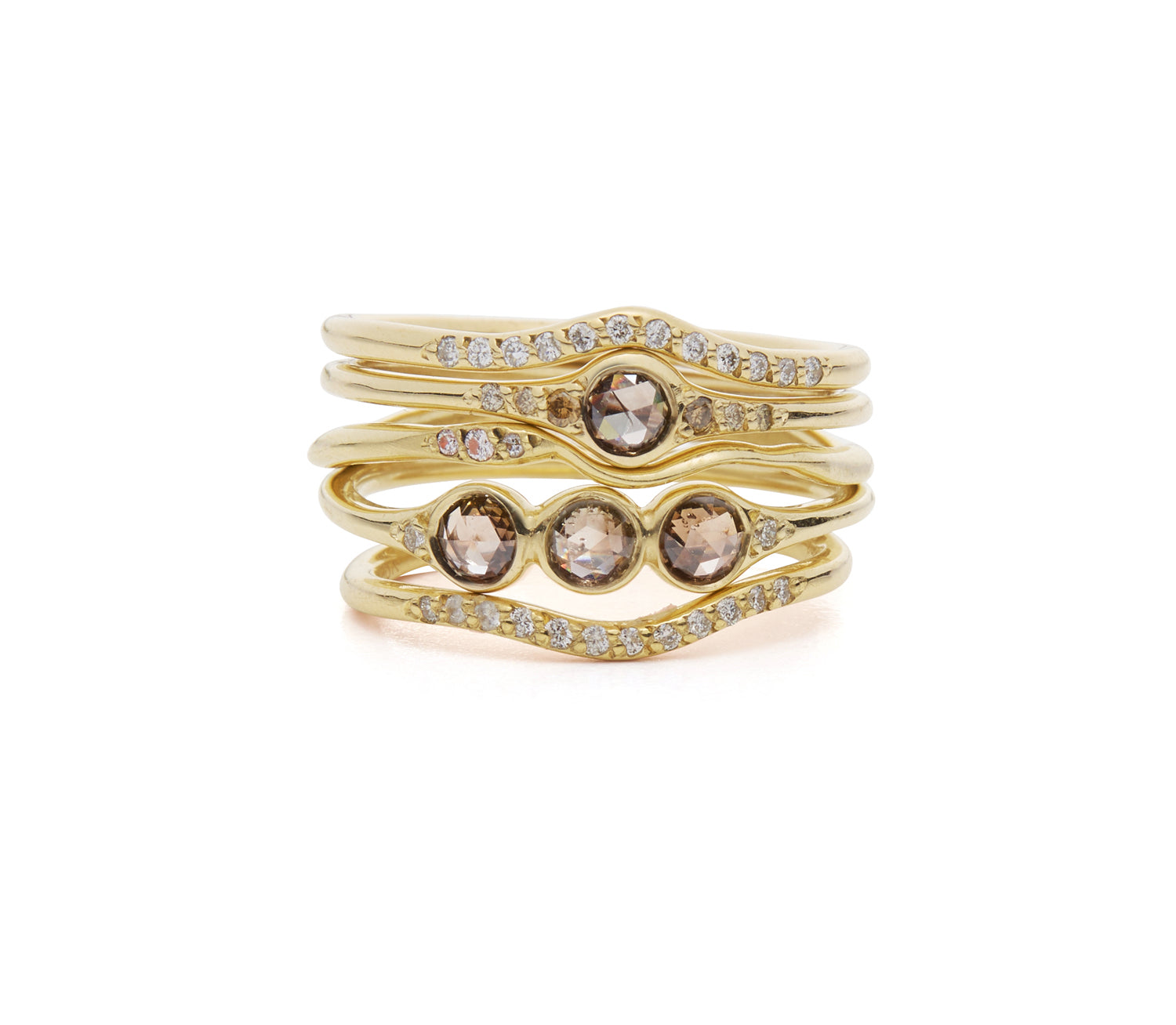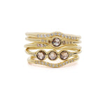 a gold ring with three round rosecut Champagne diamonds and two white diamonds. also available in black diamond, emerald, and opal.