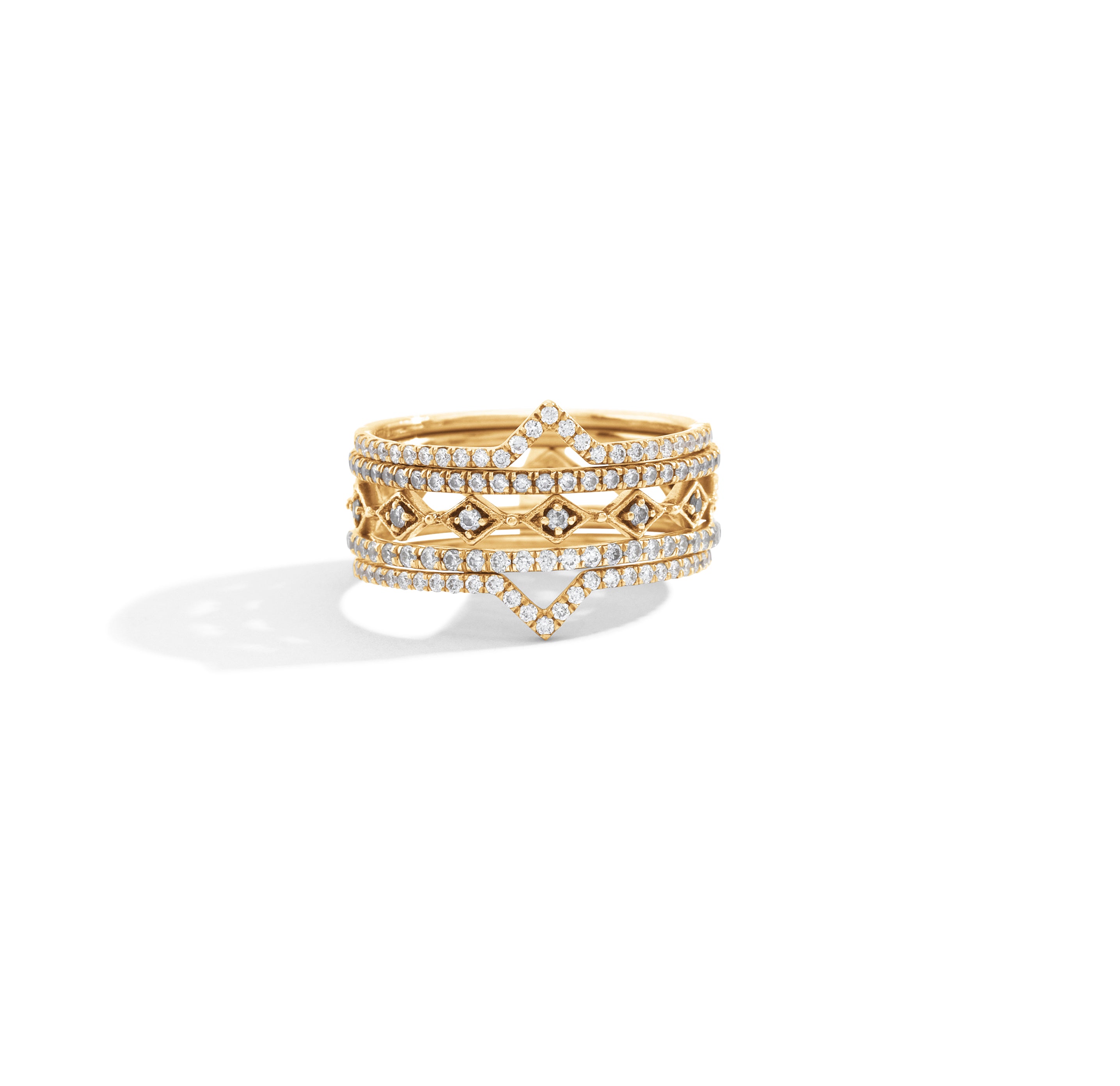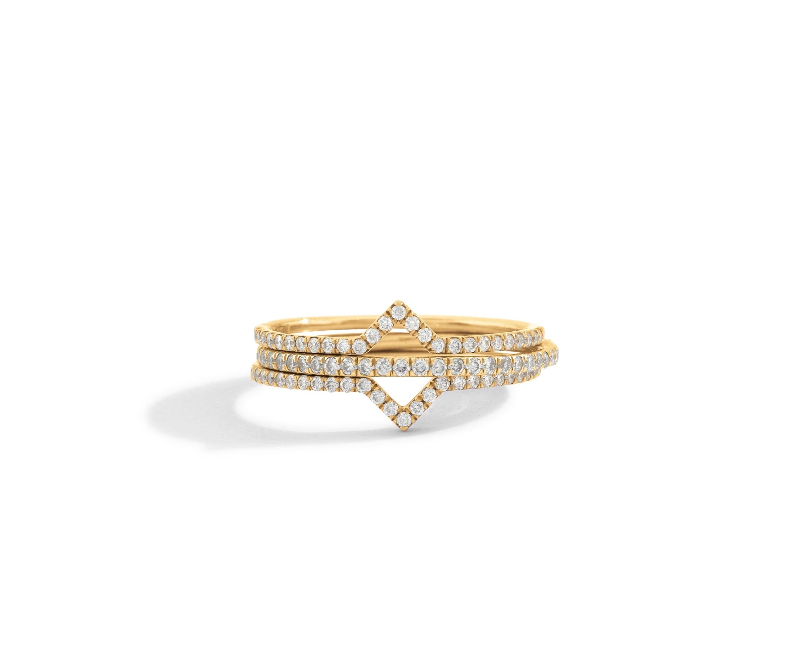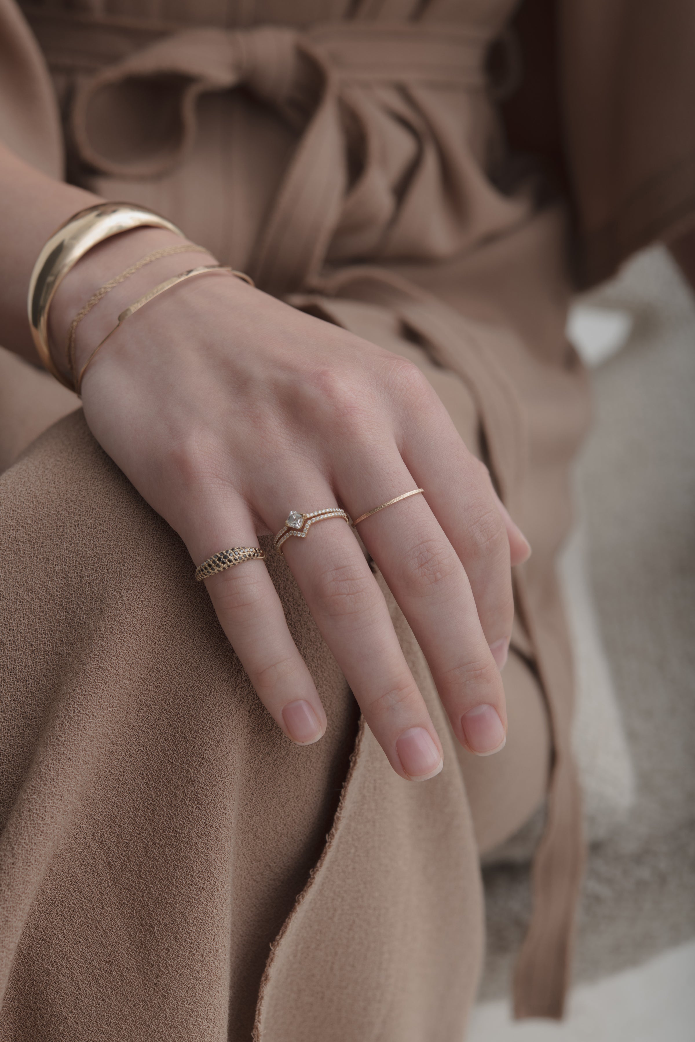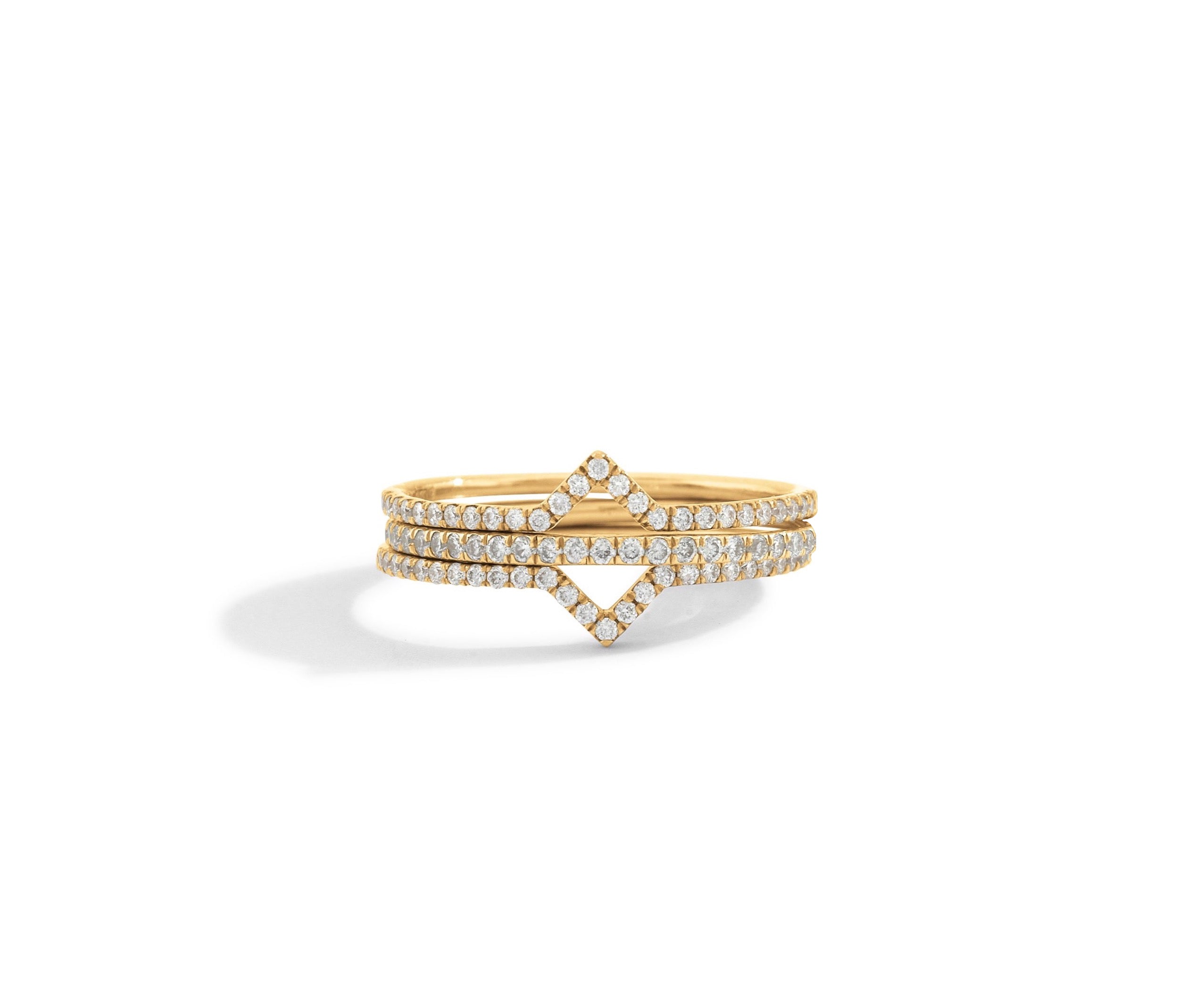 18k yellow or rose gold stacking band with a V-shape center. Looks great stacked with either another white diamond band or the vera black diamond band. Nests perfectly with our Asscher cut solitaire.