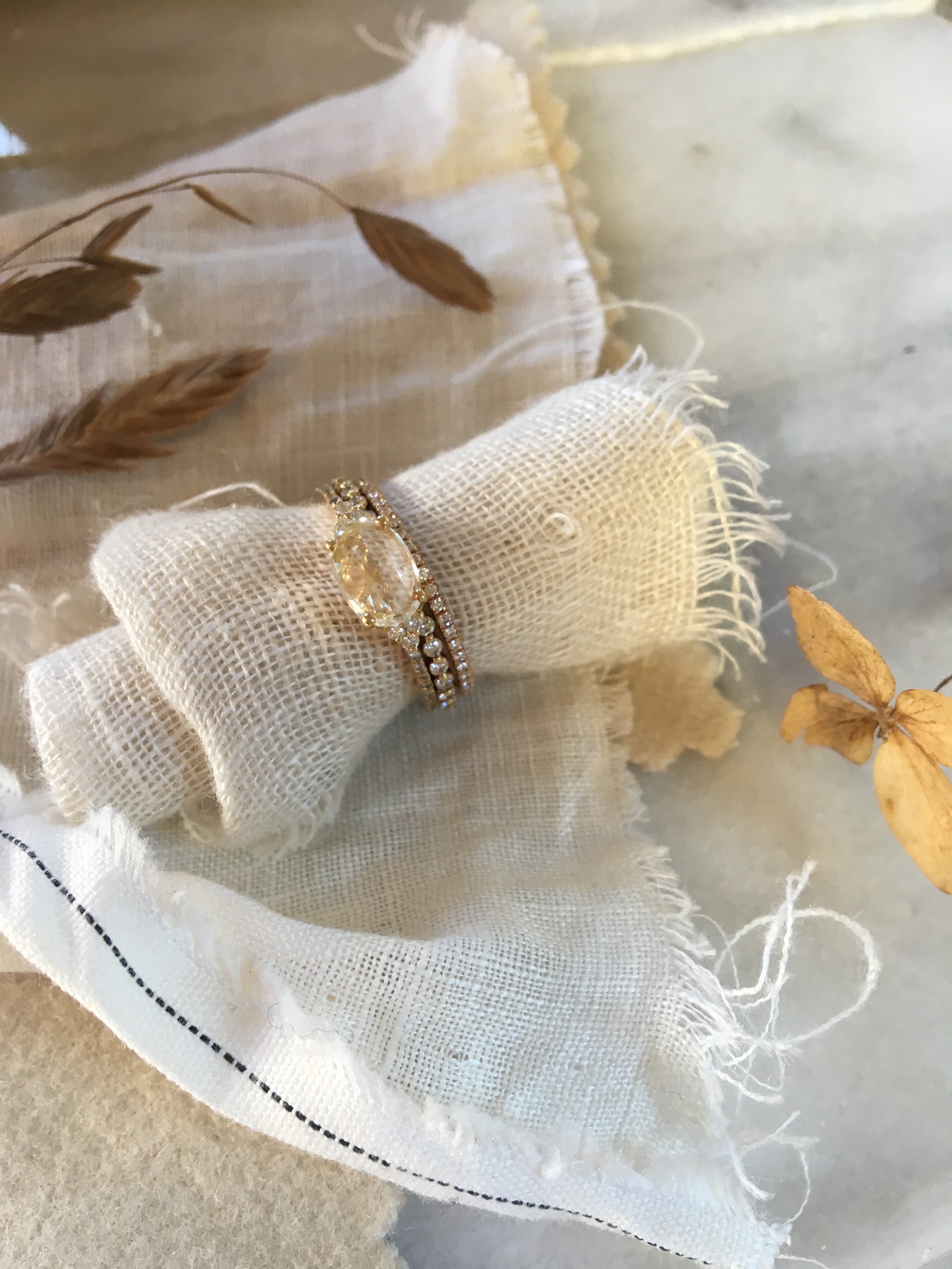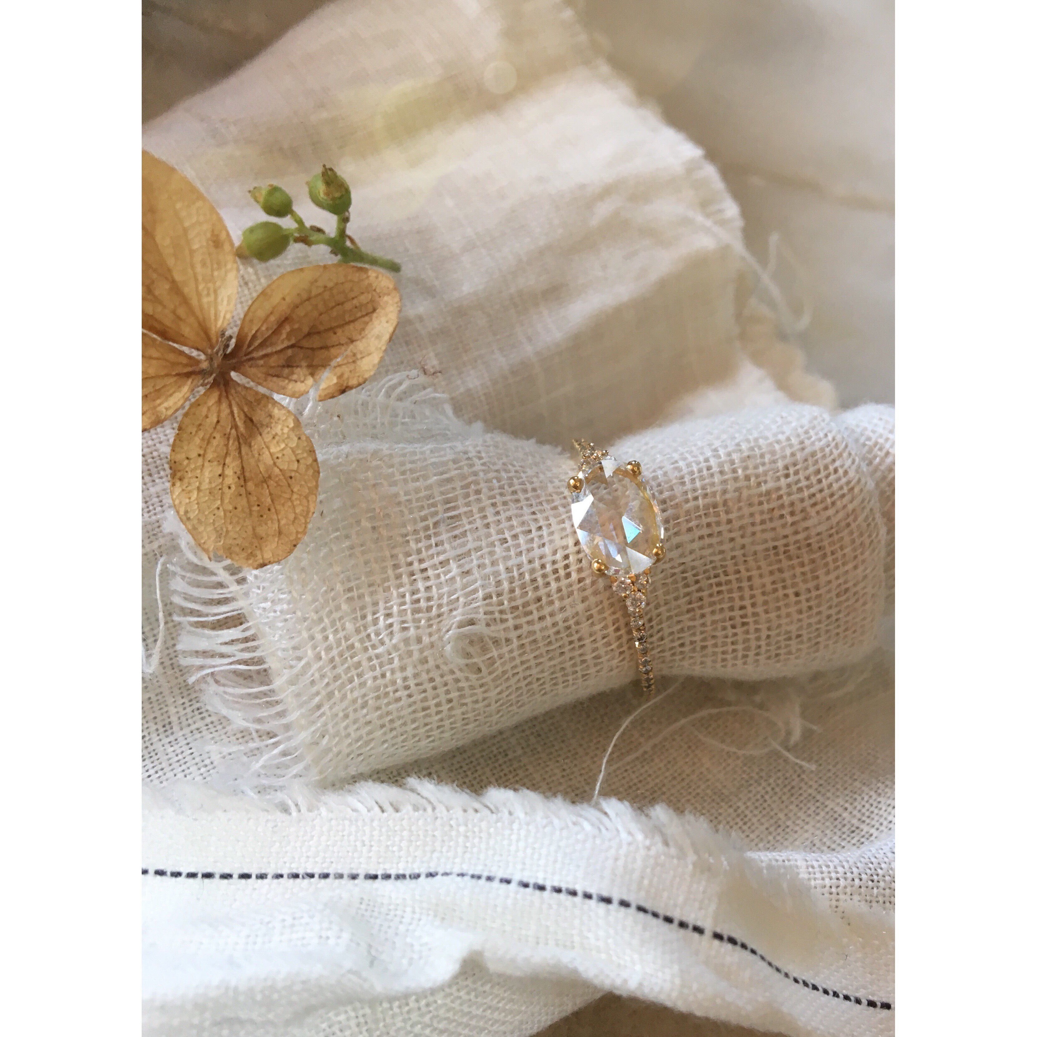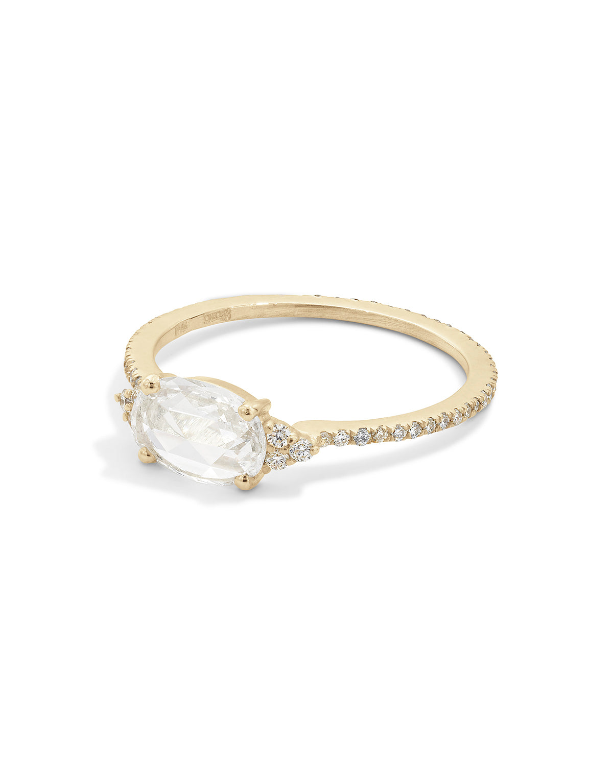 – One 8mm x 5.5mm oval rose cut center white diamond, three 1.2mm brilliant cut diamonds on either side, and white brilliant cut diamonds set pavé