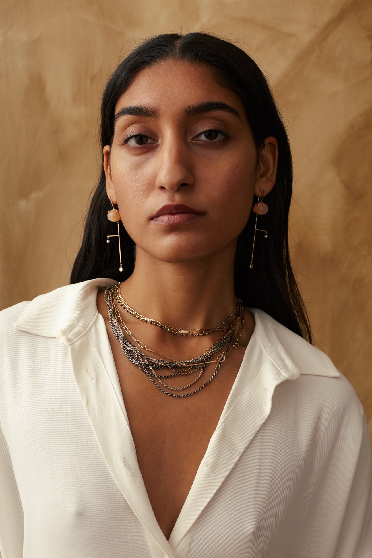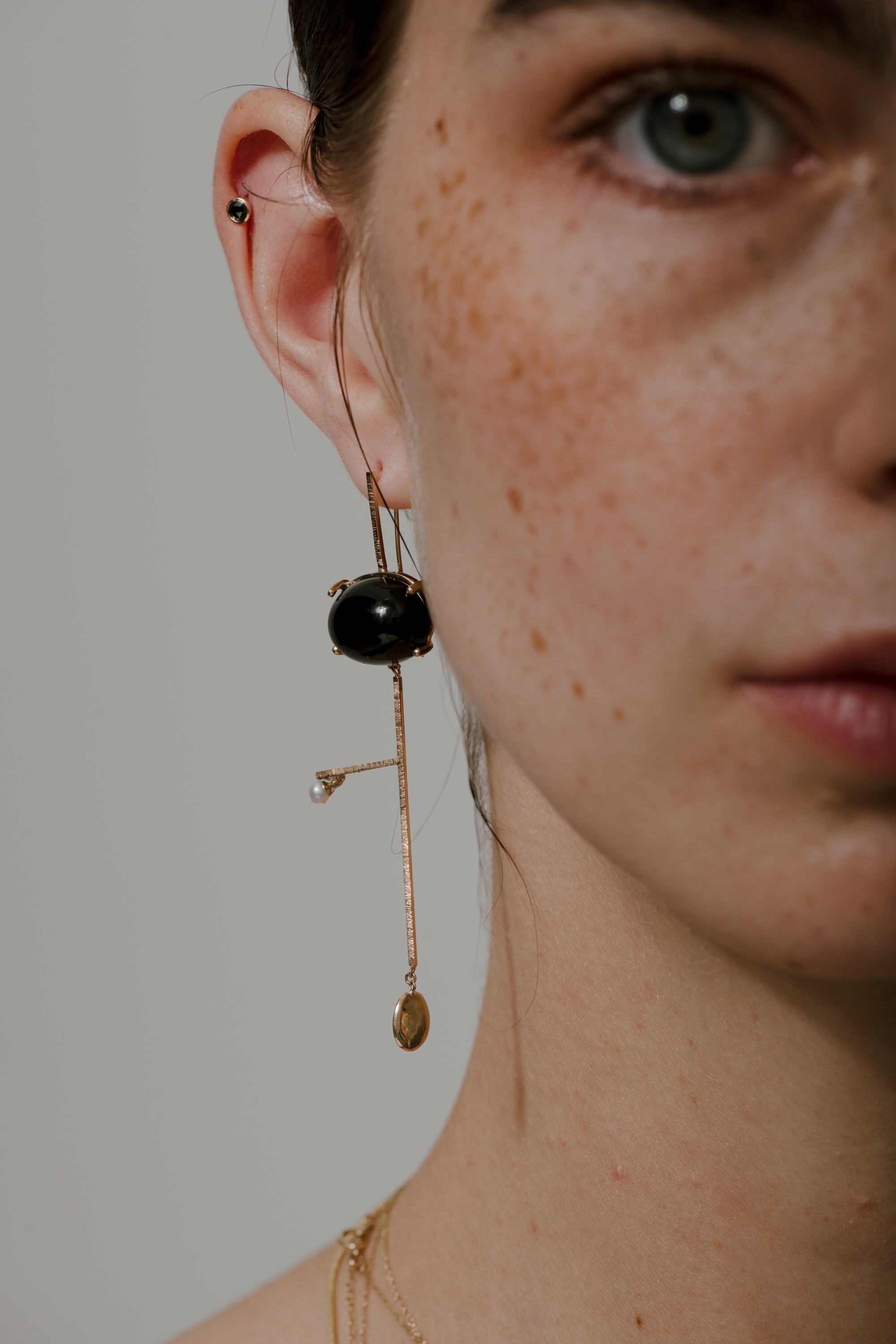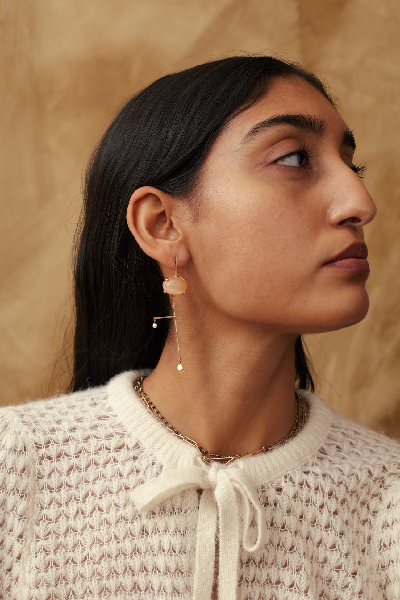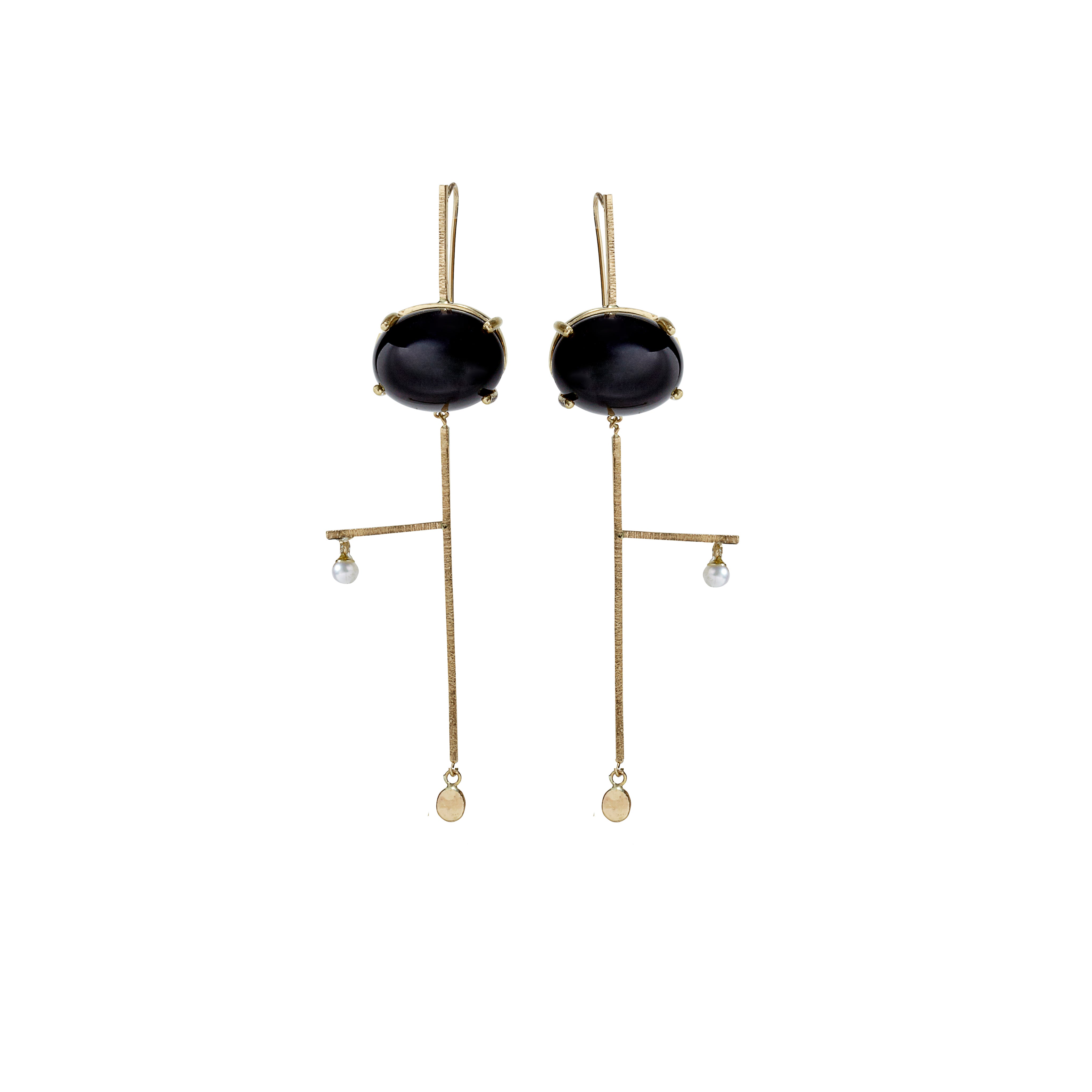 striking drop earrings with oval cabochon moonstone set in a gold basket and a textured bar of 14k yellow gold hanging below. a tiny pearl hangs from the horizontal part of the bar, and a flat oval disc hangs from the base.
