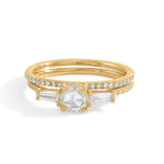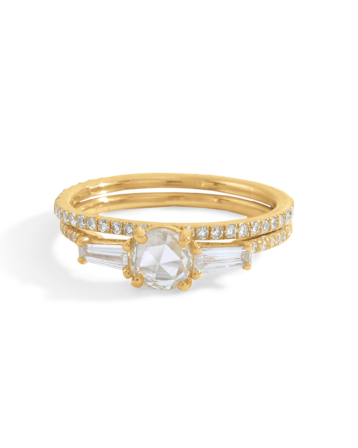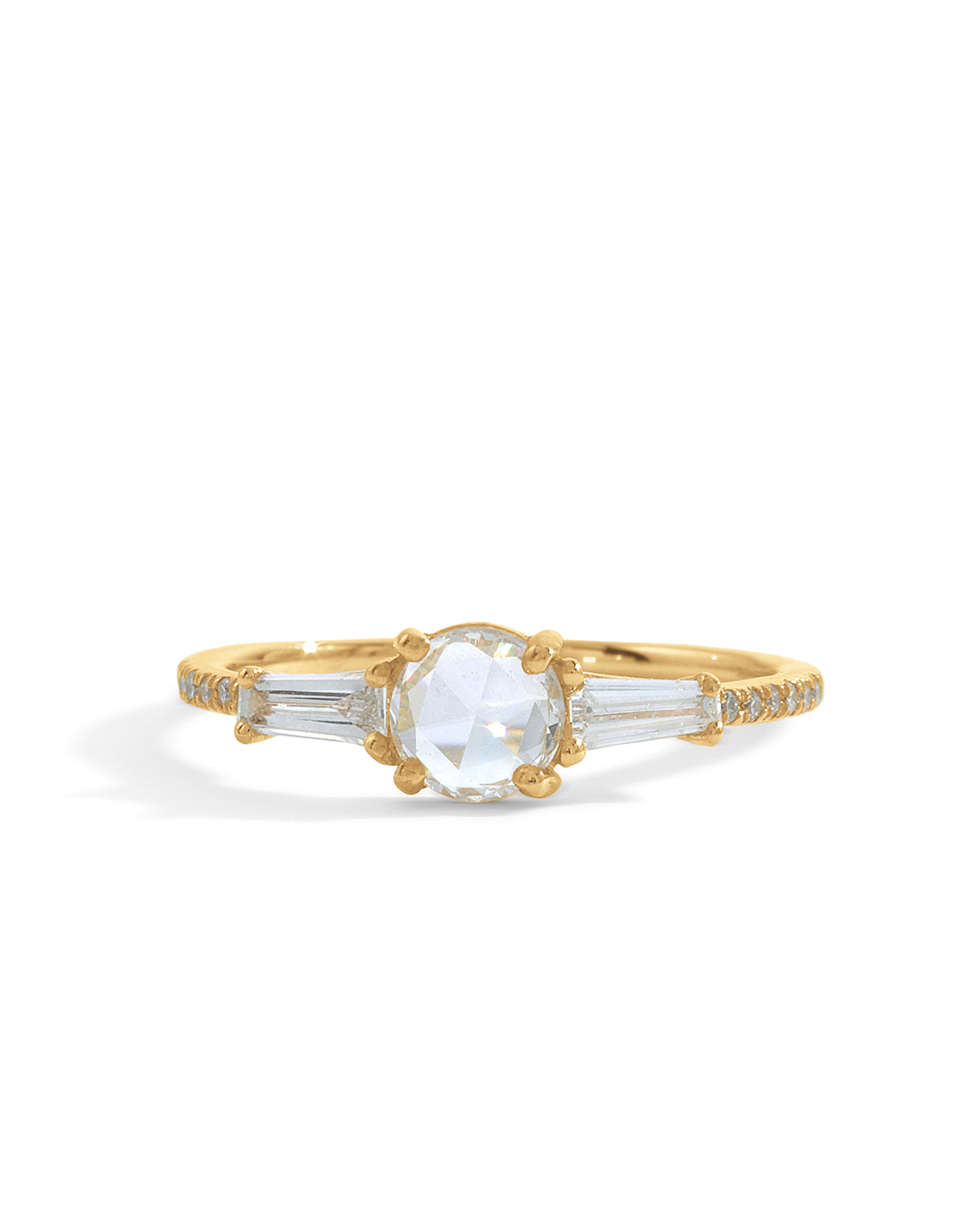 - 5mm rosecut white center diamond, two 4.4mm x 2.5 - 1.5mm tapered white baguette diamonds at either side and tiny white diamonds set pavé on the band